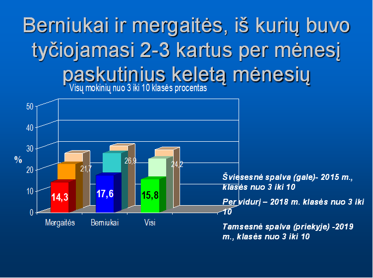 2019 m. lapkritį visi mūsų gimnazijos 3-10 klasių mokiniai dalyvavo kasmetinėje OLWEUS apklausoje apie patyčias. 2020 02 13 d. gimnazijos OPKUS veiką kuruojanti ir prižiūrinti instruktorė Jurgita Večerskienė pristatė šio tyrimo rezultatus. Ta proga susirinko OLWEUS MSG vadovai bei OLWEUS koordinacinis komitetas. Džiaugiamės, kad nuo OLWEUS PPP diegimo pradžios, kuomet pirmą kartą dalyvavome šiame tyrime ir iki dabar mūsų gimnazijoje patyčių lygis sumažėjo net 42 proc.!Vis daugiau mokinių supranta, kad tiesiog stebėti vykstančias patyčias yra blogai ir vis mažiau atsiranda norinčių tyčiotis iš nepatinkančio jiems asmens. Pusė apklaustųjų mokinių tvirtina, kad jų klasės vadovas padarė daug ir labai daug dėl to, kad klasėje nebūtų patyčių tarp mokinių. Tyrimas atskleidė ir spragas, kurias likviduoti turėsime visi kartu, kad ir toliau išdidžiai galėtumėme vadintis „OLWEUS MOKYKLA“.