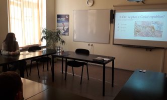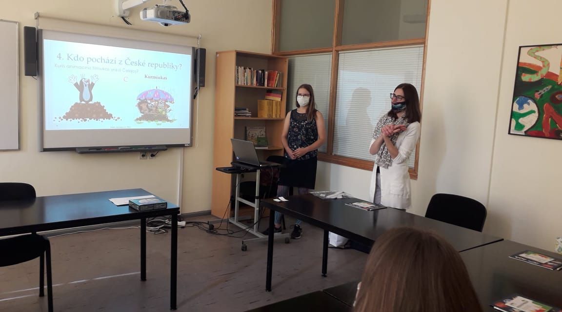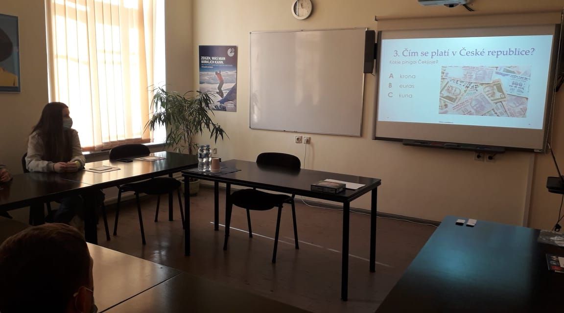 Kėliau nuvykome į „Kalbų centrą“. Čia apžiūrėjome labai gražius ant sienos vaikų pieštus piešinius. Dalyvavome kalbų dirbtuvėse. Pasiskirstėme į 3 grupes po 6 žmones ir mokėmės čekų, kroatų ir graikų kalbų. Vieną grupę 2 merginos iš Čekijos ambasados mokė čekų kalbos. Pamoka buvo labai įdomi. Pasirodo, čekų kalba panaši į lenkų kalbą. Per tą pamoką mes išmokome porą čekiškų žodelių. Gana greitai išsprendėme ir kryžiažodį. Gavome dovanų - knygelę apie Čekiją ir žemėlapį.