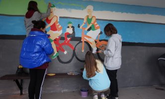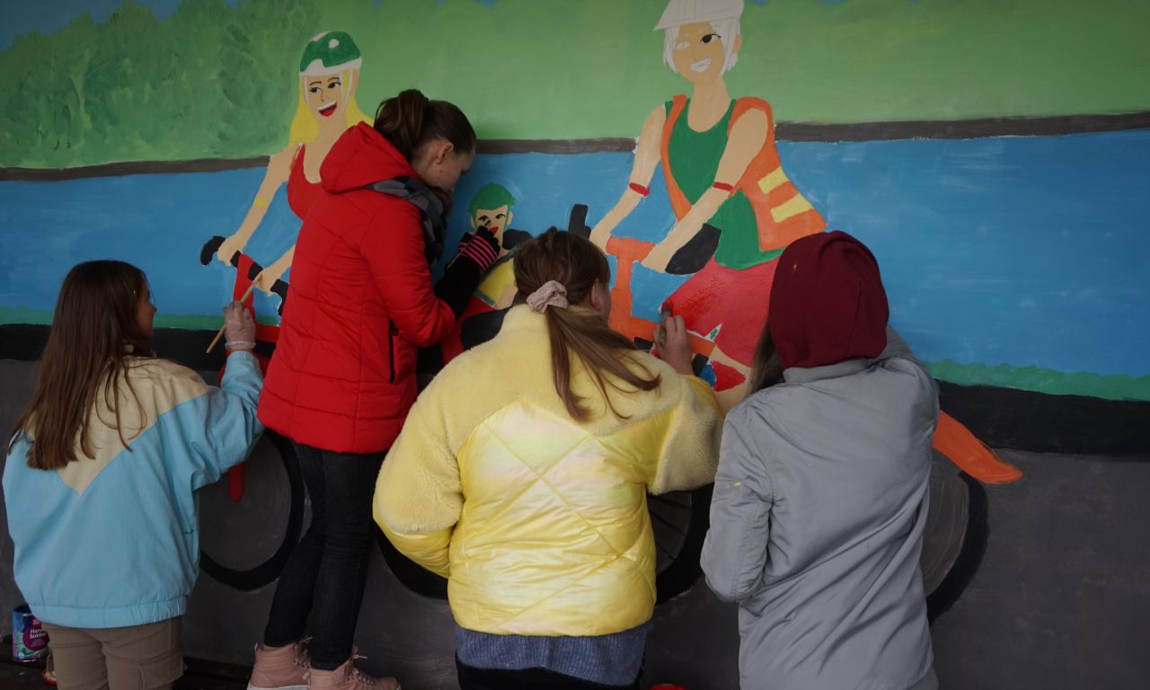 Šiuo renginiu siekiama atkreipti eismo dalyvių dėmesį į saugaus eismo svarbą, skatinti visus eismo dalyvius keliuose elgtis atsakingai. Austėja piešė dviratininkus, o visi kiti mokiniai tapė ir spalvino pagal jos eskizą. Piešėme apie 3 valandas, tačiau niekas nepavargo. Buvo įdomu tapyti ne ant popieriaus lapo, o ant stotelės sienos.