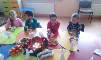 Popietę pradėjau pasakojimu apie Adventą. Prisiminėme, ką reiškia šis žodis. Išsiaiškinome, kad Adventas - keturios savaitės, kurias simbolizuoja keturios žvakės. Papasakojau, ką kiekviena žvakė reiškia. Kalbėjome apie 12 patiekalų, kuriuos šeimininkės ruošia šv. Kūčių stalui. Vaikams papasakojau iš ko ir kaip yra pinamas Advento vainikas. Jie tai galėjo pamatyti, paliesti, pamėginti patys pinti. Klasėje pynėme vainiką, puošėme žaisliukais. Darėme angelėlius, gėrėme arbatą, valgėme šv.Kūčių stalo patiekalus. Popietė baigėsi Kalėdų senelio skambučiu, ir gavome užduotį: ieškoti grupėje paslėptų dovanėlių. Popietę baigėme vieni kitiems palinkėdami ramių, šiltų, sveikų švenčių.