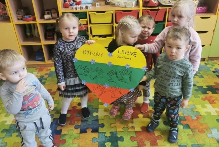 Vėliau peržiūrėjome filmuką pagal Vytauto Landsbergio pasakojimą ,,Sausio sniegenos‘‘. Savo mažų delniukų pagalba padarėme bendrą darbelį ,,Laisvę švenčiame‘‘ .