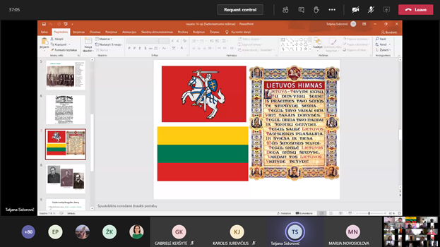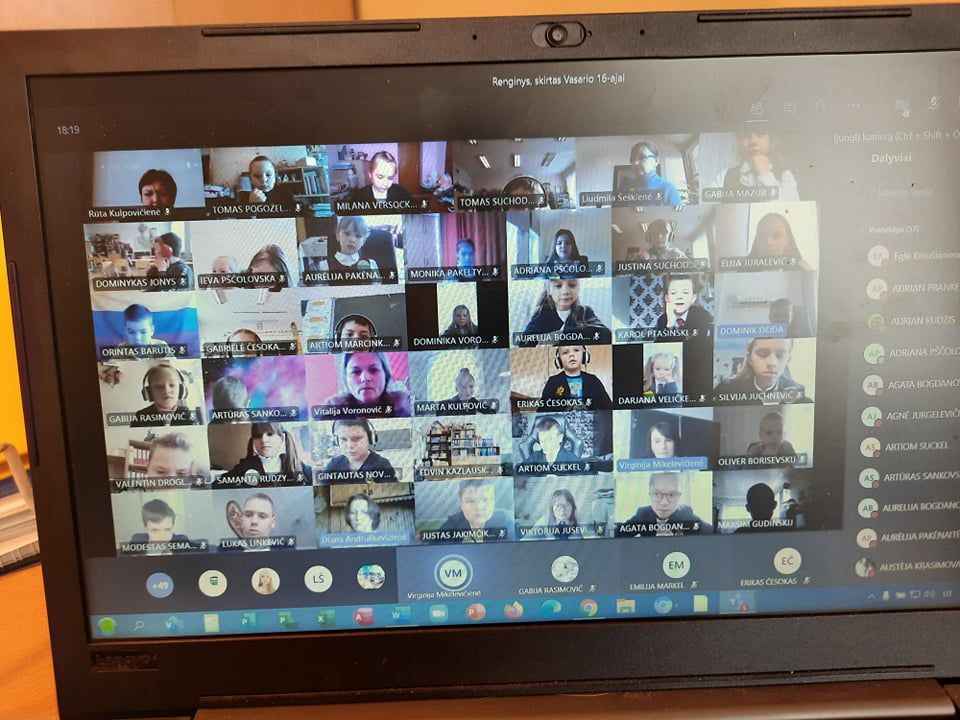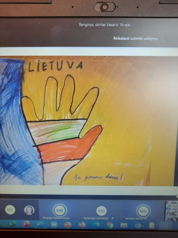 Vasario 16-oji – nacionalinė Lietuvos šventė. Tai diena, skirta 1918-aisiais Lietuvos Tarybos signatarų pasirašytam Lietuvos nepriklausomybės aktui paminėti. Mūsų gimnazijos bendruomenė Vasario 16-ąją švenčia kasmet. Šiemet šią šventę minėjome prieš mokinių Žiemos atostogas – vasario 12-ąją. Ikimokyklinių ir priešmokyklinės grupių vaikai, kurie ugdomi gimnazijoje, išmoko dainelių, eilėraščių. Mokytojų padedami lietuviška simbolika papuošė gimnazijos langus. Kiti mokiniai renginiuose dalyvavo nuotoliniu būdu. Pradinių klasių mokiniai dainomis, posmais, nuoširdžiais žodžiais sveikino Lietuvą su jos gimtadieniu. Vyresnieji mokiniai prisiminė mūsų krašto istoriją, žiūrėjo dokumentinį filmuką „Pasivaikščiojimas po Vilnių Vasario 16-osios Akto signatarų keliais“, skaitė poeziją apie Lietuvą, grožėjose gimtojo krašto vaizdais žiūrėdami mokytojų paruoštą filmuotą medžiagą.