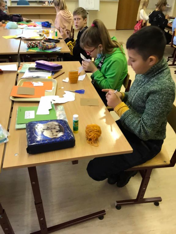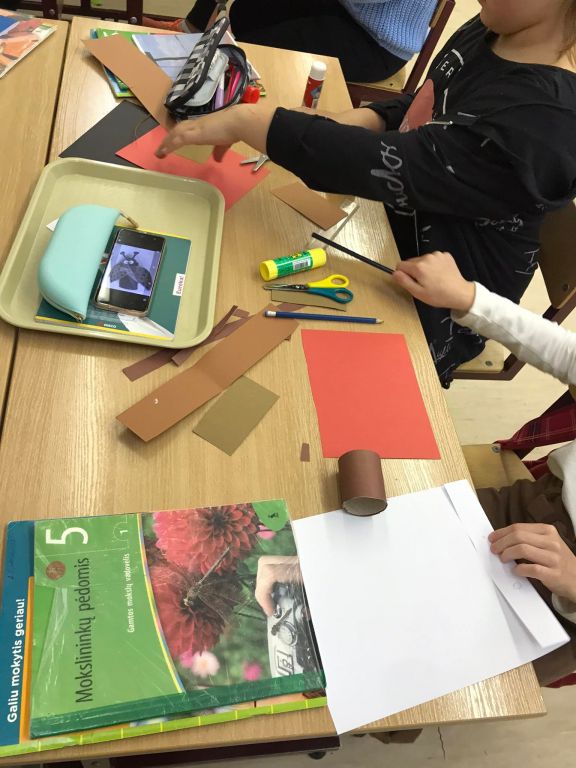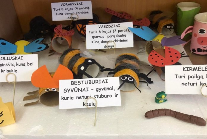 Spalio mėnesį 5 klasės mokiniai gamtos pamokų metu susipažino su bestuburių ir stuburinių gyvūnų grupėmis bei pažino jų požymius, o savo įgytas žinias pritaikė gamindami gyvūnėlių muliažus. Mokiniai, naudodami spalvotą popierių, siūlus, kartoną, vienkartinius puodukus, plastiliną ir t.t., gamino įvairių bestuburių ir stuburinių gyvūnų muliažus. Džiaugiuosi, kad visuose bestuburių gyvūnų muliažuose atsispindėjo tos grupės, kuriai priklauso šis gyvūnėlis, požymiai. Tikiu, kad po šių pamokų mokiniai lengvai atpažins, kokiai gyvūnų grupei priklauso jų pagamintas gyvūnėlis. Penktokų darbeliai padės mokytis kitiems vaikams.