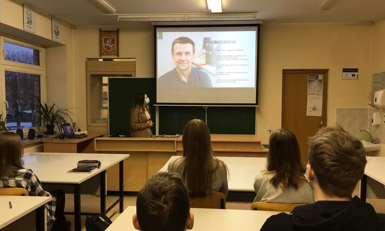 IIIG klasės mokinė Inesa Steckevič pristatė Virginijų Šikšnį, biochemiką, VU profesorių, kurio svarbiausia mokslinio darbo sritis – fermentų struktūros ir funkcijos ryšys, nukleorūgščių fermentai, bakterijų priešvirusinės apsaugos sistemos (restrikcijos endonukleazės, CRISPR-Cas ir kt.). Už genomo redagavimo įrankio atradimą, sukėlusį revoliuciją medicinoje, prieš keletą metų profesoriui V. Šikšniui buvo įteikta prestižinė Kavli premija, vadinam žingsniu iki Nobelio premijos. Mokslininkas yra gavęs ne vieną apdovanojimą už savo mokslinius tyrimus ir nuopelnus mūsų šaliai. Jo vardu įsteigta stipendija gabiausiems gyvybės mokslų srities studentams, o VU V. Šikšniui ir jo komandai skyrė 100 000 eurų tikslinę dotaciją „Gyvybės kodo perrašymas“ už indėlį į pasaulinio lygio mokslo atradimus.