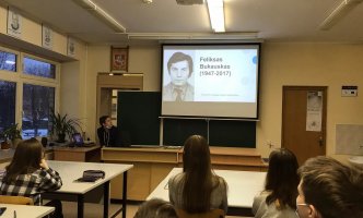 IVG klasės mokinė Patricija Miliun paruošė prezentaciją apie biofiziką prof. Feliksą Bukauską, kurią pristatė IVG klasės mokinys Nortas Barutis,. Šio mokslininko darbo sritis – širdies elektrofiziologijos ir ritmo sutrikimų diagnostika bei gydymas, ląstelių, ypač vėžinių, tarpusavio sąveika. Paskelbė daugiau kaip 100 mokslinių straipsnių. Apdovanotas LSSR valstybine premija (1983), SSRS valstybine premija (1988).