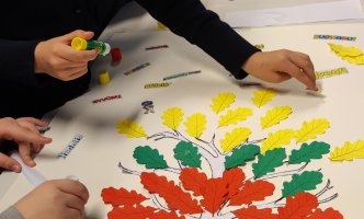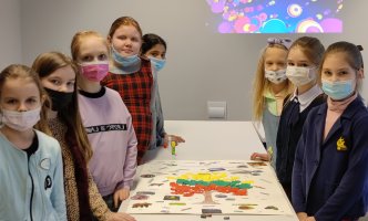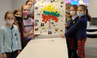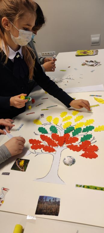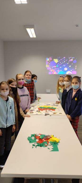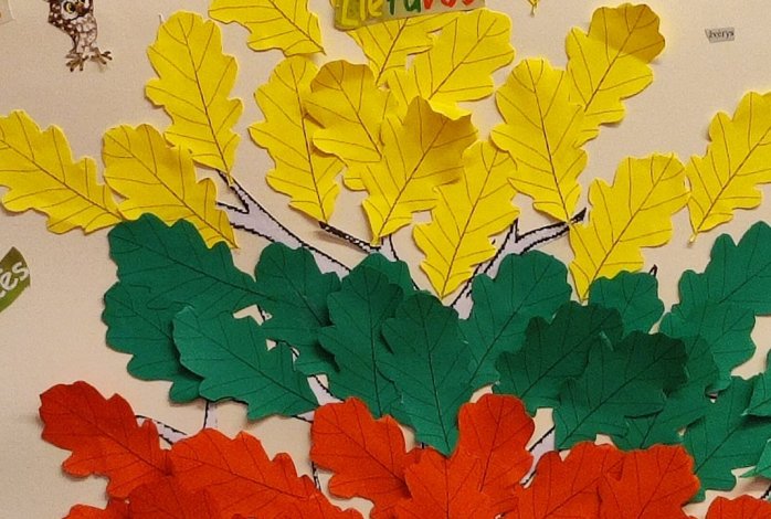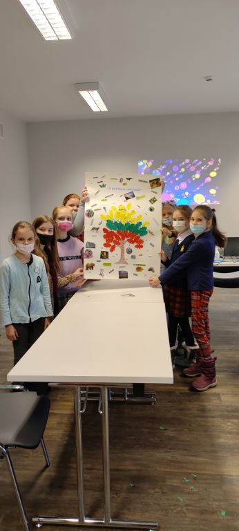 Vėliau apžiūrėjome bibliotekoje eksponuojamą parodą ,,O kas gi tu esi, Tėvyne, jei ne mes...“, skirtą Vasario 16–ajai. Vaikų laukė edukacinė – kūrybinė valandėlė, skirta Vasario 16-ajai – Lietuvos valstybės atkūrimo dienai - paminėti. Trečiokai, dirbdami grupėse, papuošė „medžius“ Lietuvos vėliavos spalvų lapais, gražiausiais žodžiais apie Lietuvą ir gamtos vaizdų paveikslėliais. Pabaigę pristatė savo plakatus, pasidžiaugė gražiais darbeliais ir ,žinoma, gavo dovanų - po penalą su rašikliu, knygų skirtuką ir saldainį.