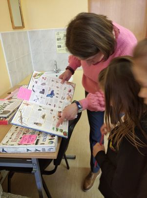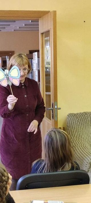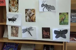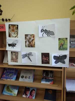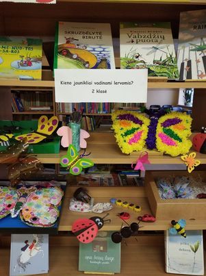 Bibliotekoje mokiniai apžiūrėjo pačių pagamintų vabzdžių parodėlę, o mokytoja Liuda pakvietė pasirinkti ir paskaityti knygelių, kurių veikėjai - vabzdžiai.