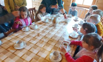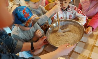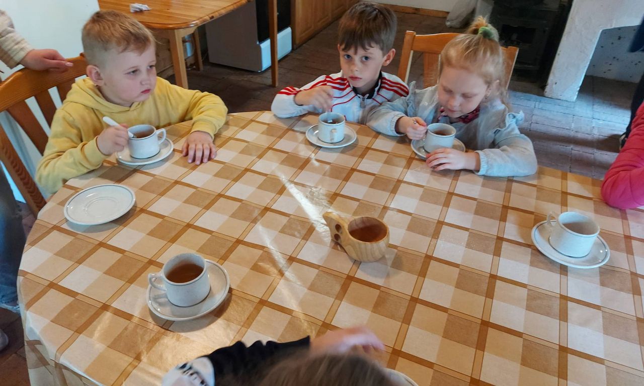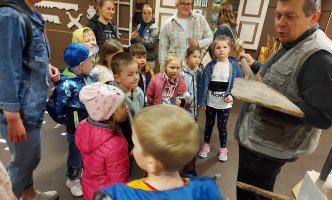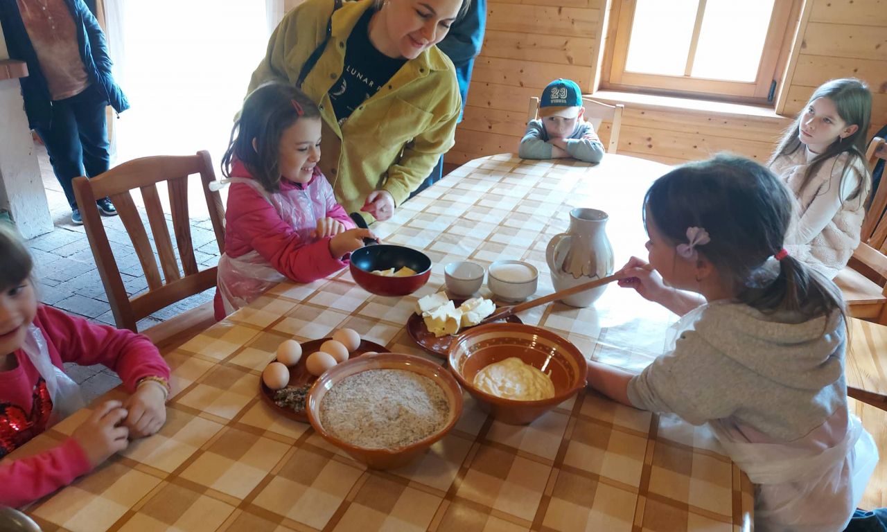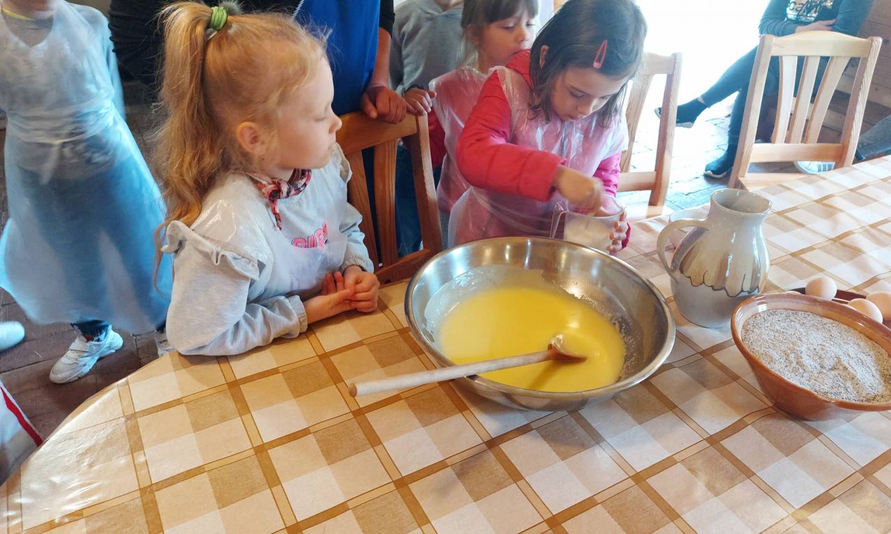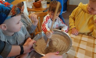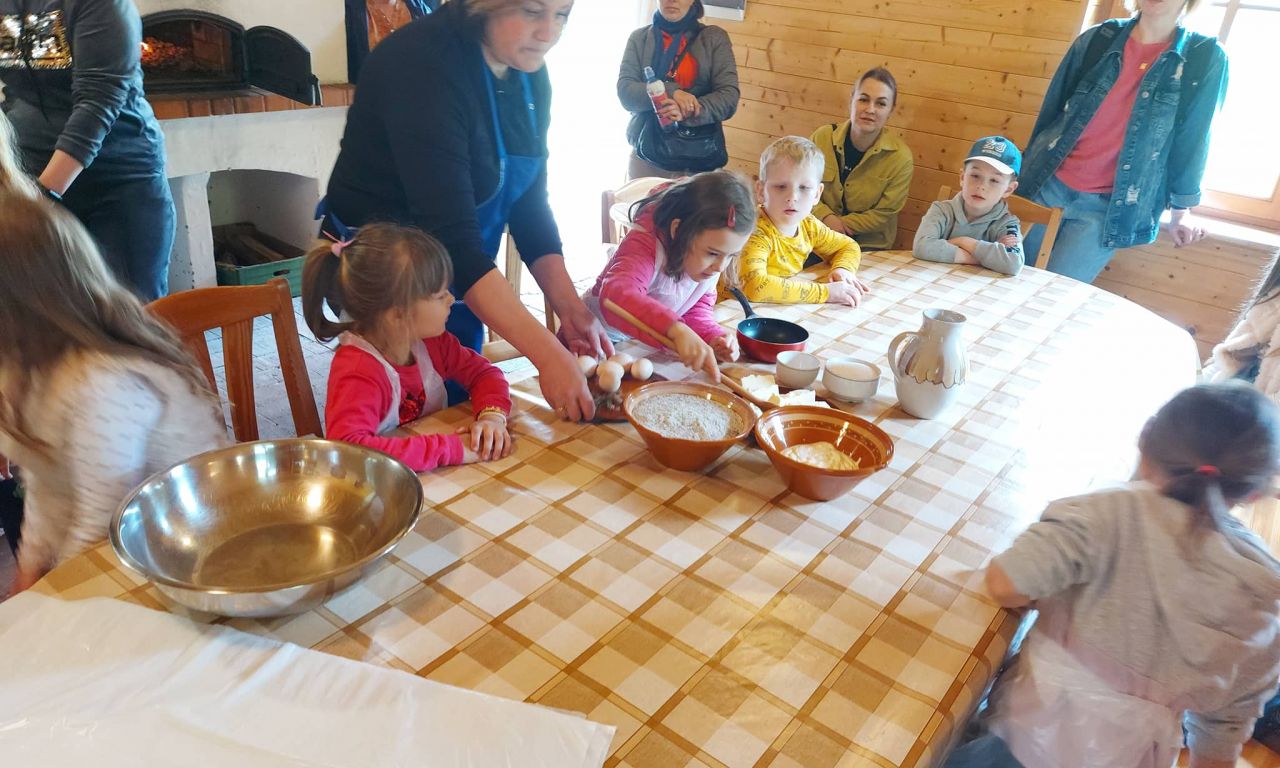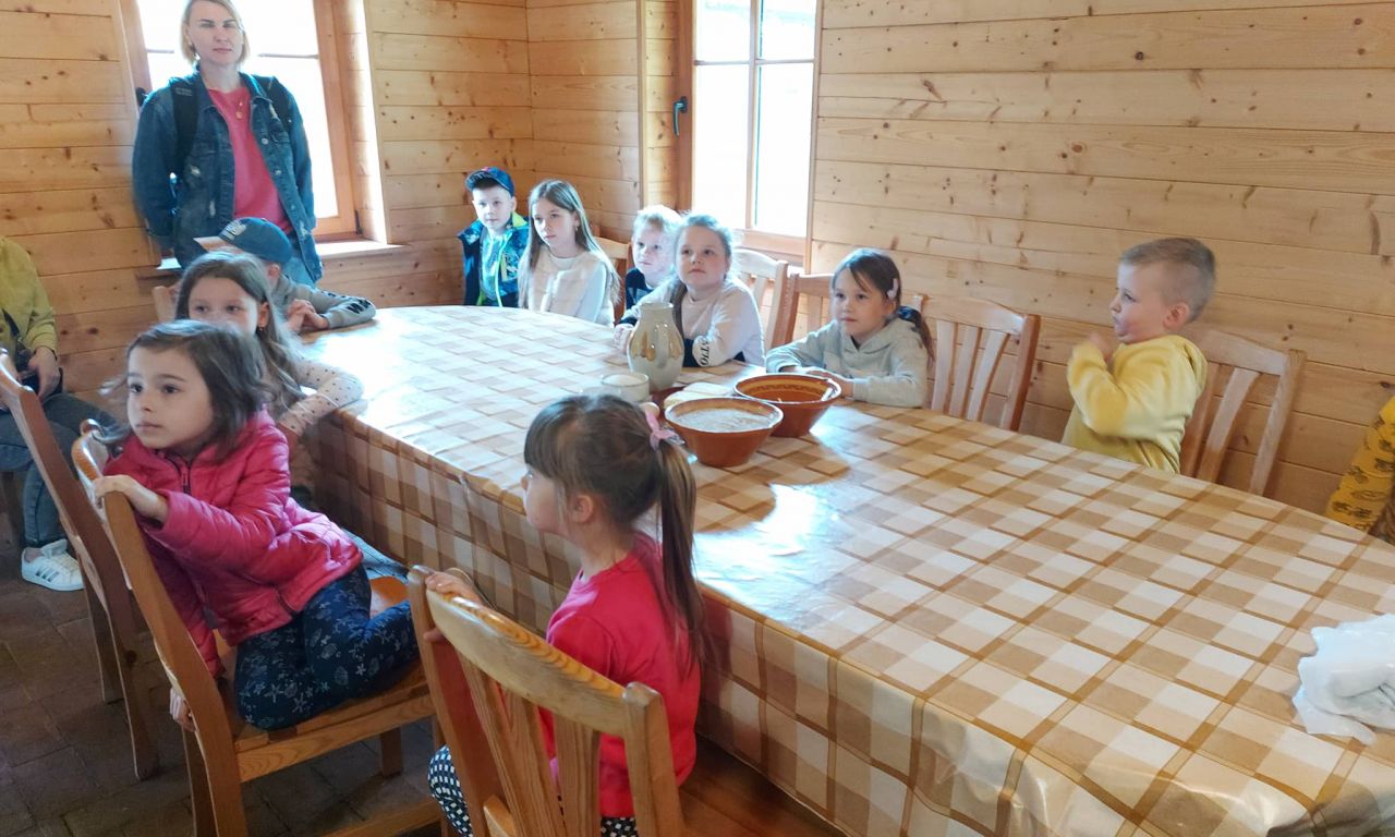 Pasivaikščioję gryname ore, vaikučiai praalko. Taigi, kelionė tuo nesibaigė. Važiavome į Darželių kaimą kepti „grikinės babkos“. O kas ta „grikinė babka“ , nė vienas neįsivaizdavo! Mus pasitiko kepėja. Visi galvojo, kad „grikinė babka“ jau iškepta, o ne... , pasirodo kepsime ją patys. Vaikai užsirišo prijuostes ir kibo į darbus: maišė tešlą, plakė kiaušinius ir.... Po gero pusvalandžio pakvipo visa patalpa, vaikai nekantriai laukė stebuklo, kurį patys iškepė. Pasivaišinę arbata ir „grikine babka“, pilni įspūdžių grįžome namo. Kelionė pavyko, buvo labai smagu.