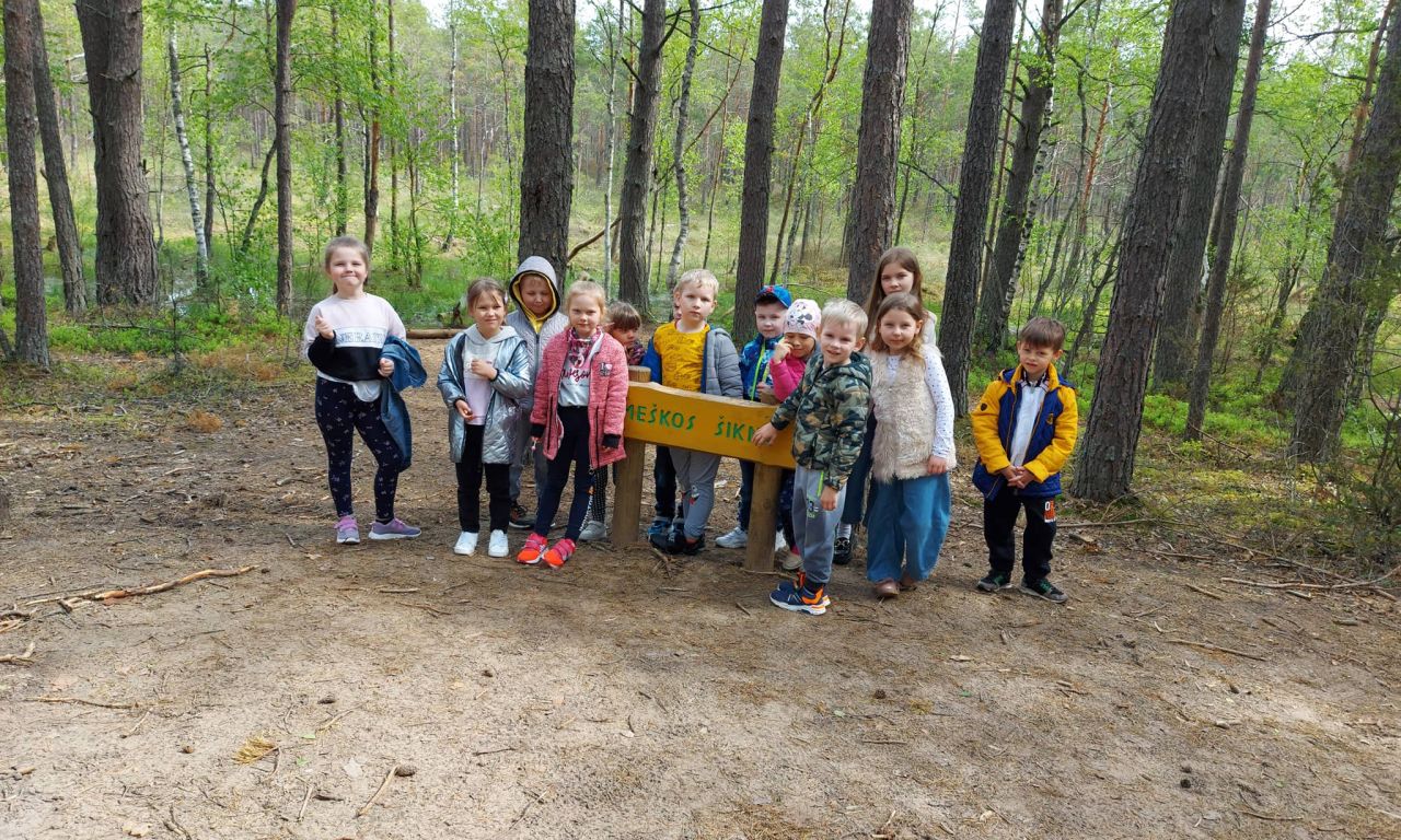 Vaikai sužinojo, kaip atsiranda tokios pelkės, kodėl jų paviršiumi galima vaikščioti (na, mes to nebandėme), o įdomiausias ir juokingiausias vaikams buvo šios pelkės pavadinimas - „Meškos šikna“. Toliau eidami miško taku vaikai išvydo smėlio kopas. Lipant į kopas apėmė jausmas, kad tuoj tuoj išvysime jūrą, nes smėlis tikrai toks kaip prie jūros, o aplink pušaitės.