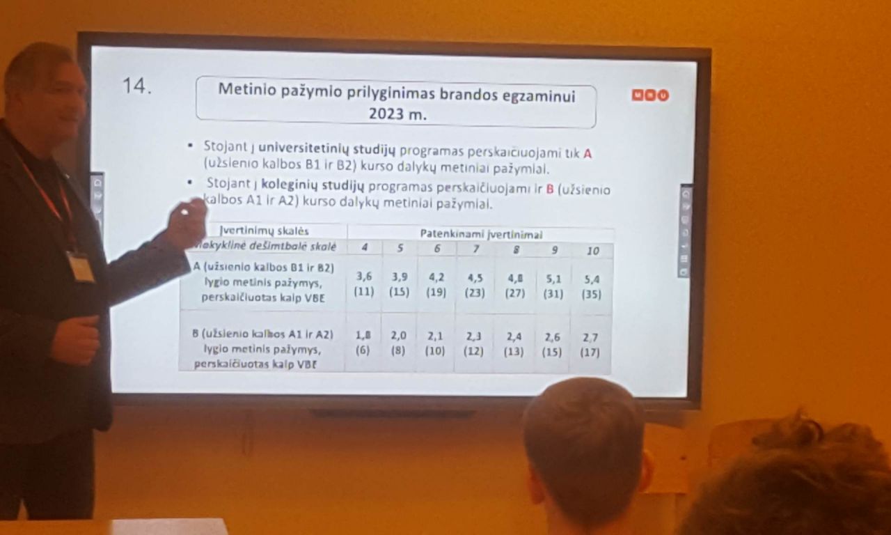 Sausio 26 d. III-IVG klasių gimnazistai 3 pamokos metu dalyvavo susitikime su Mykolo Romerio universiteto Nacionalinio priėmimo grupės vadovu Sauliumi Bugailiškiu. Susitikimo metu Saulius supažindino mokinius su studijų programomis, priėmimo tvarka. Akcentavo tai, kas svarbu abiturientams ir ko tikėtis IIIG gimnazistams. Pabrėžė kiekvienų mokslo metų skirtumus, nes reikalavimai vis keičiasi. Paaiškino, kaip yra skaičiuojamas konkursinis balas, skirstomos valstybės finansuojamos vietos, kaip kryptingai sudėlioti prioritetus ir kt. Universiteto atstovas atsakė į pateiktus klausimus, išdalino lankstinukus apie siūlomas programas, trumpai kiekvieną pakomentavo. Patarė, kad renkantis studijų programą, pirmiausia reikia pamąstyti ir nuspręsti, ką jaunas žmogus norėtų dirbti, o tik paskui leistis į studijų programų paieškas. Manau, susitikimas tikrai buvo naudingas.