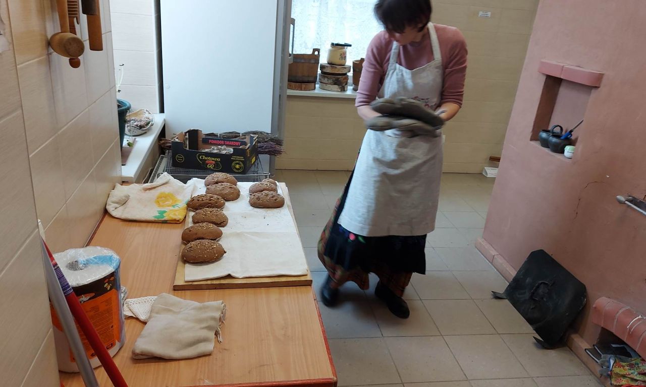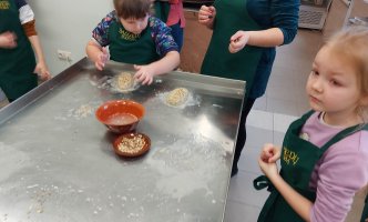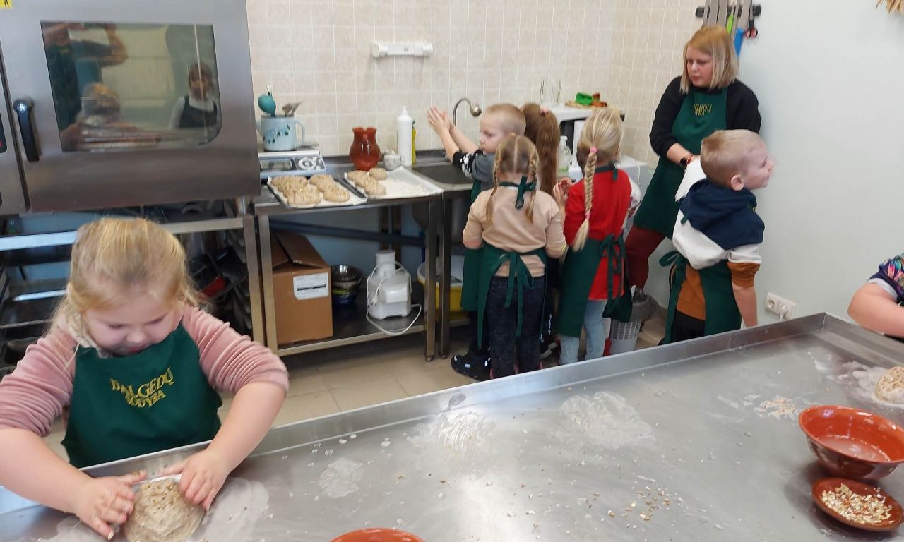 Amatų centre mus pasitiko centro vadovė ir amatininkė. Pirmiausiai vaikučiams trumpai papasakojo, ką veiksime, priminė saugumo taisykles. Pasipuošę prijuostėmis ėjome į virtuvę prie didelio stalo. Kiekvienas iš paruoštos tešlos formavo savo duonos kepalėlį. Pašovus duoneles į krosnį, vaikučiams buvo pasakojama ir rodoma iš kur ir kaip atsiranda duona, aiškinama, kaip duonelė buvo kepama senovėje. Kalbėjome ir apie tai, kad šiandien duoną iškepti jau lengviau negu anksčiau.