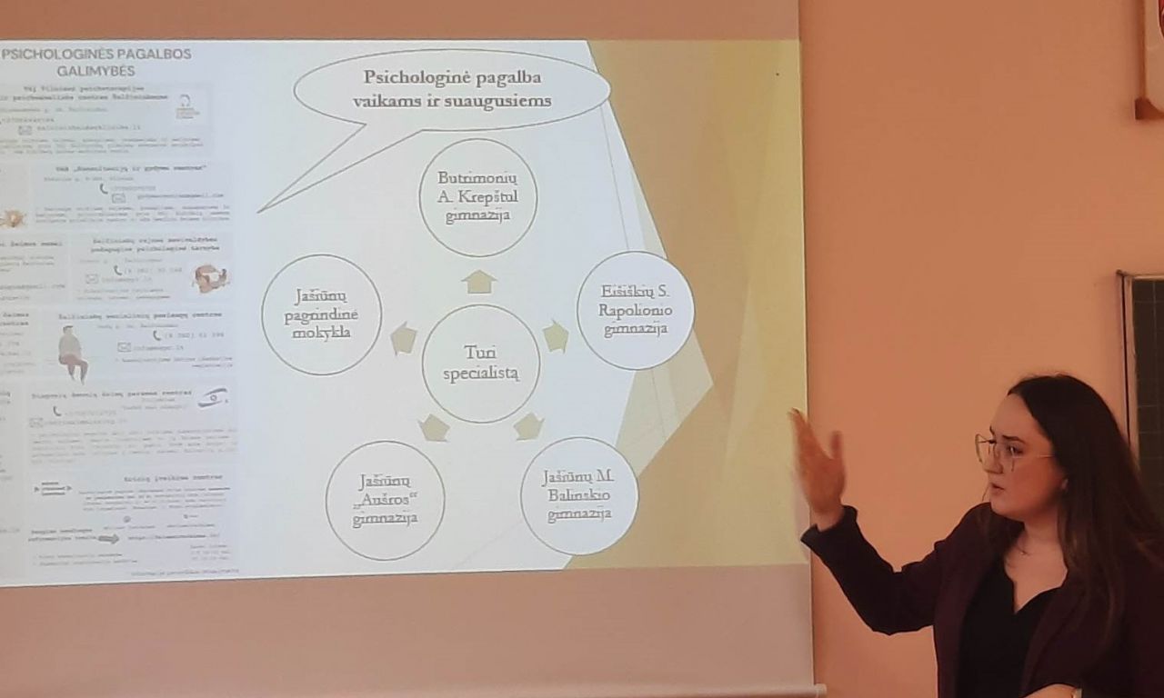 Jurgita Lapinskaitė-Tolstošejeva, Šalčininkų r. sav. administracijos Tarpinstitucinio bendradarbiavimo koordinatorė, susitikimo metu pristatė pranešimą „Pagalbos galimybės dirbant su vaiku“. Specialistams buvo kalbėta apie vaiko minimalios priežiūros priemonių skyrimą, koordinuotai teikiamos pagalbos teikimą, kai teikiamos pavienės paslaugos yra neefektyvios siekiant užtikrinti vaiko gerovę ir pan. Tarpinstitucinio bendradarbiavimo koordinatorė akcentavo, kad Šalčininkų rajone yra vykdoma Ankstyvosios intervencijos programa, kurios tikslas - motyvuoti 14- 21 m. jaunuolius atsisakyti šių psichoaktyvių medžiagų vartojimo kol dar nėra susiformavusi priklausomybė. Kalbėta ir apie kognityvinę elgesio korekcijos programą „EQUIP“, kuria siekiama mokyti paauglius mąstyti ir elgtis atsakingai taikant savitarpio pagalbos metodą, motyvuoti ir įgalinti juos teikti pagalbą vienas kitam. Be to, susirinkusiems buvo priminta apie Multidimensinės šeimos terapijos (MDFT) programą, atkreiptinas dėmesys, kad MDFT - yra visapusiška, į šeimą orientuota elgesio keitimo programa vaikams ir jaunuoliams, kurių elgesys ryškiai skiriasi nuo įprastų amžiaus, kultūros ir etinių normų, nepasiduoda poveikiui, taikomam bendrojo ugdymo aplinkoje, yra socialiai nepriimtinas, delinkventinis, agresyvus, provokuojantis, susijęs su staigiais emocijų pokyčiais. Dalyvauti MDFT programoje gali 11-17 m. amžiaus vaikai.
