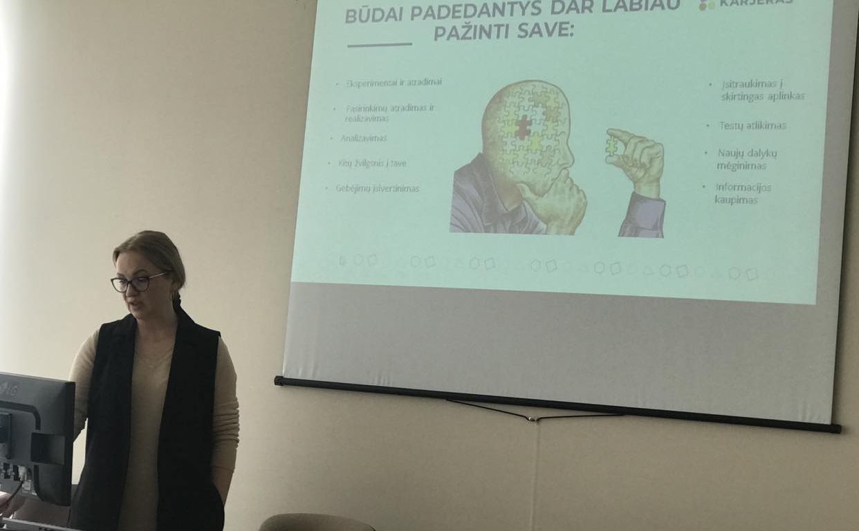 Užimtumo tarnybos specialistė Inesa Korklinevskienė kalbėjo apie svarbą pasirenkant profesijas, studijas. Pabrėžė, kad savęs pažinimas tai yra pirmasis žingsnis atskleidžiant asmeninius rezervus, nukreipiant save teisinga karjeros linkme ir galimybė dirbti mėgstamą darbą. Žinojimas, ką turiu savyje padeda suvokti savo ,,realųjį aš“ (koks aš esu esamuoju laiku) ir ėjimą link ,,idealaus aš“ (kokiu noriu būti). Save geriau pažinti galima dviem būdais: atsitiktinai, dėl aplinkos įtakos ir išorinių įvykių arba vidinių pokyčių, arba tikslingai, sąmoningomis pastangomis. Išklausę pranešimą, mokiniai sėkmingai įtvirtino naujai įgytas žinias atsakydami į testo klausimus. Vėliau diskutavo apie profesijas, galimus pasirinkimus.