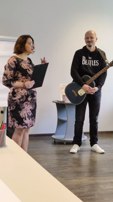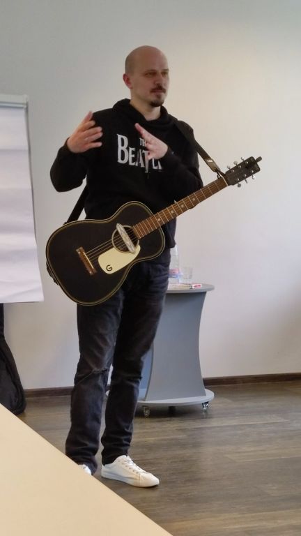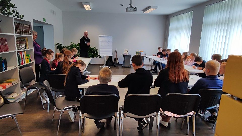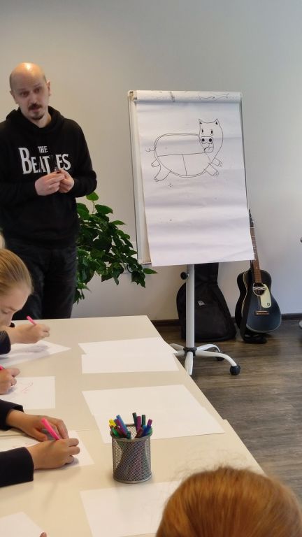 Eišiškių Vaikų bibliotekoje mus pasitiko be galo charizmatiškas ir malonus žmogus su gitara. Vaikai dainavo, netgi trumpam tapo kūrėjais – kūrė bendrą iliustraciją, piešė povandeninį laivą – rožinį paršelį, o susitikimui artėjant į pabaigą, visi gavo rašytojo autografą ir apipylė menininką klausimais...apie jo pomėgius, kūrybą, vaikystę, svajones...ir t.t. .