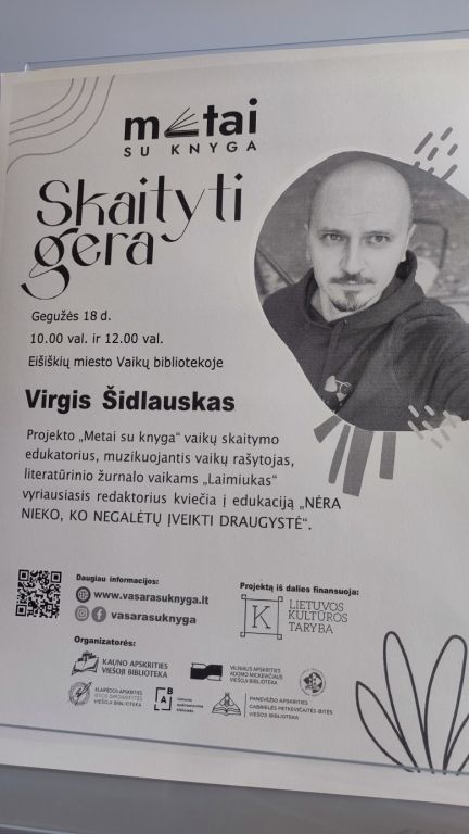 Gegužės 18 dieną 4a klasės mokiniai skubėjo į iš anksto suplanuotą susitikimą su Virgiu Šidlausku – rašytoju ir literatūrinio žurnalo „Laimiukas“ vyr. redaktoriumi, išleidusiu šešias prozos knygas vaikams. Nuo pat pirmosios – „Ulfas ir stebuklinga barzda” autorius pastebimas skaitytojų bei vaikų literatūros vertintojų, jo knygos dažnai patenka į geriausiųjų penketukus. Rašytojui būdingas gyvas, žaismingas bendravimas su auditorija, paįvairinamas muzikos bei dailės akcentais.