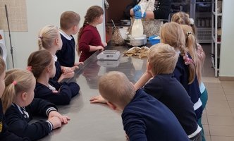 Sūrininkė Dalytė parodė, kaip iš rauginto pieno pasigaminti varškę, kaip paruošti varškę sūrio spaudimui. Kiekvienas pirmokas svėrė po 200 g paruoštos varškės, dėjo į sūrmaišius, o tuomet - sūrių slėgtuvę. Kol sūriai buvo slėgtuvėje, amatų centro vedėja Sigita papasakojo vaikams apie naminius gyvūnus, jų priežiūrą ir naudą žmogui. Mokiniai atliko kūrybinę užduotį: turėjo nuspalvinti karvutę, kuri duoda jų norimo skonio pieną (bananinį, ledų, apelsinų ir kt.), Pirmokai sugalvojo karvutei vardą.