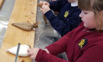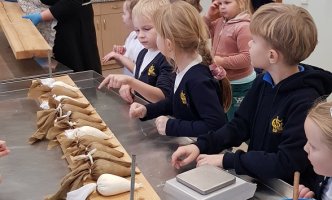 1B KLASĖS MOKINIAI SPAUDĖ SŪRĮ DARGUŽIŲ AMATŲ CENTRE
