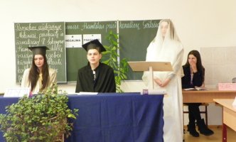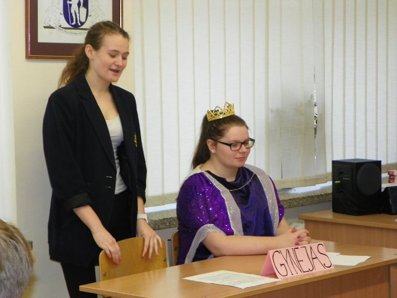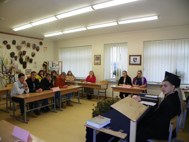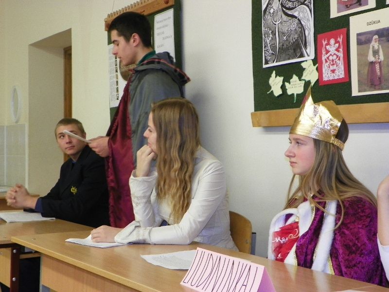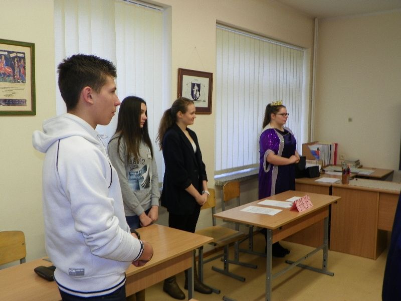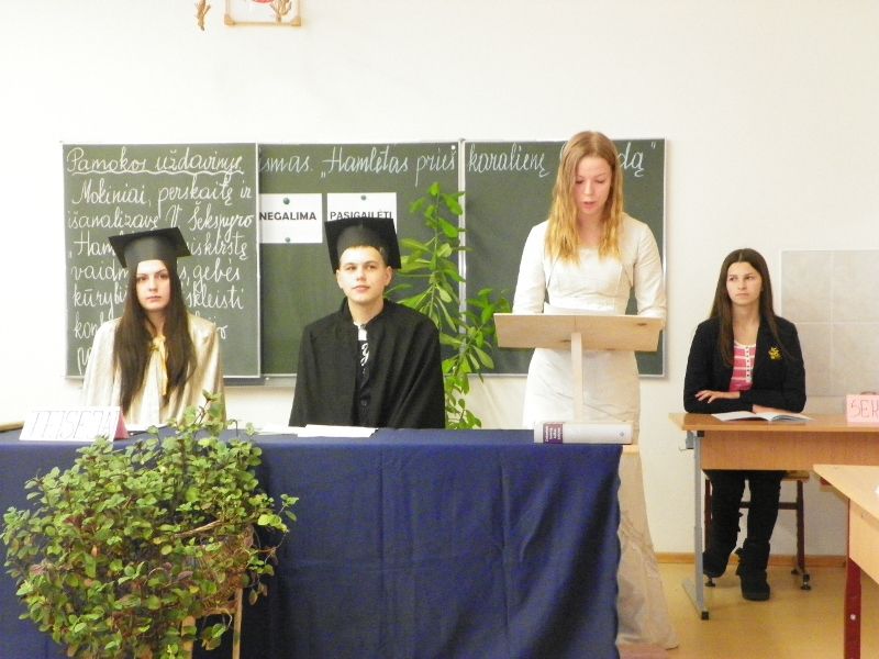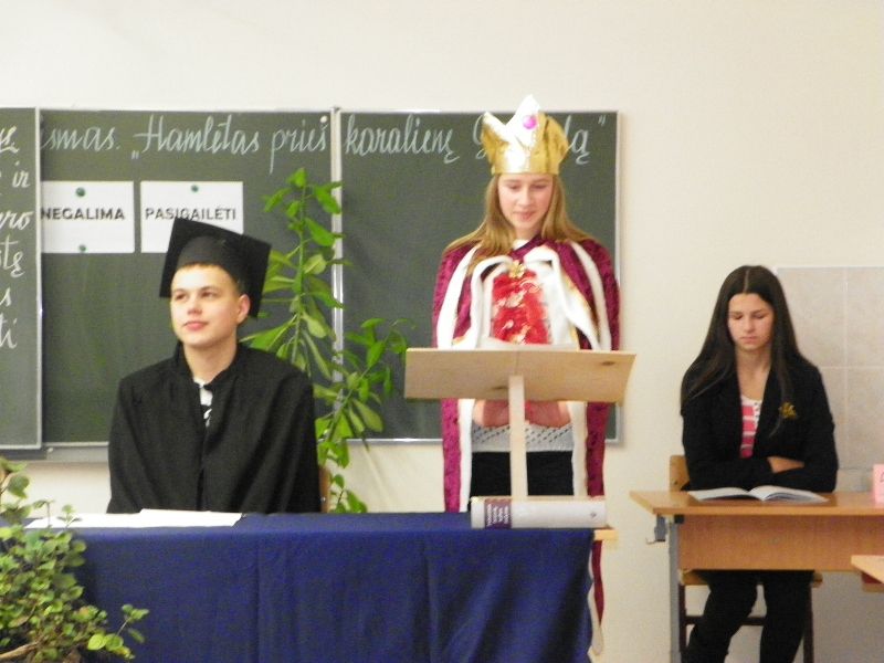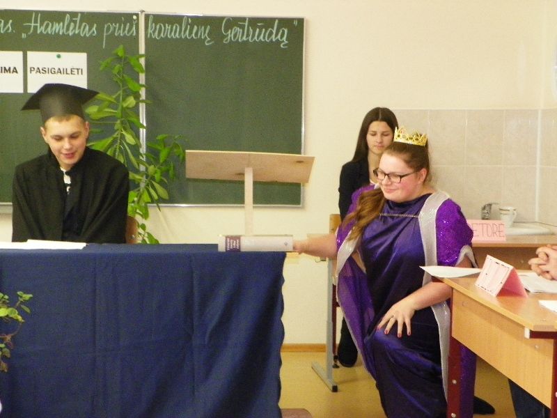 Lietuvių kalbos kabinetas virto ,,teismo sale“. ,,Visiems stot! Teismas eina,“ – garsiai ištarė teismo sekretorė (V.Parfimovičiūtė). Taip prasidėjo neįprasta literatūros pamoka. Teismo pirmininkė (teisėja M. Bruzgelevič), pranešė, kad karalienė Gertrūda kaltinama sūnaus Hamleto nesirūpinimu ir išdavyste. Prokuroras (R.Brozovskij), įgaliotas Hamleto (V.Leikauskas), sakydamas savo kalbą, negailėjo skaudžių žodžių karalienei, kaltino Gertrūdą ir kitais nusikaltimais, pateikė daiktinį įrodymą. Karalienė (K.Makarenko) neprisipažino kalta, o karalius Klaudijus (A.Jancevič) nuoširdžiai gailėjo silpnos moters, kuriai teko tokia sunki dalia. Vienas po kito buvo kviečiami liudytojai: Horacijus (V.Antul), Ofelija (S.Parvickytė), Hamleto tėvo dvasia (K.Choružaja). Uždėję ranką ant ,,Biblijos‘‘ ir prisiekę sakyti tiesą, jie pasakojo apie karalienės Gertrūdos, karaliaus Klaudijaus ir Hamleto santykius, atsakinėjo į teisėjo (A.Šibeko) klausimus. Advokatė (S.Kucevič) ginamojoje kalboje įtikinamai stengėsi paveikti teisėjus ir prisiekusiuosius bei išteisinti karalienę Gertrūdą. Teisėjai ir prisiekusieji, išklausę visų kalbų ir pasitarę, paskelbė nuosprendį: karalienė pripažinta kalta.