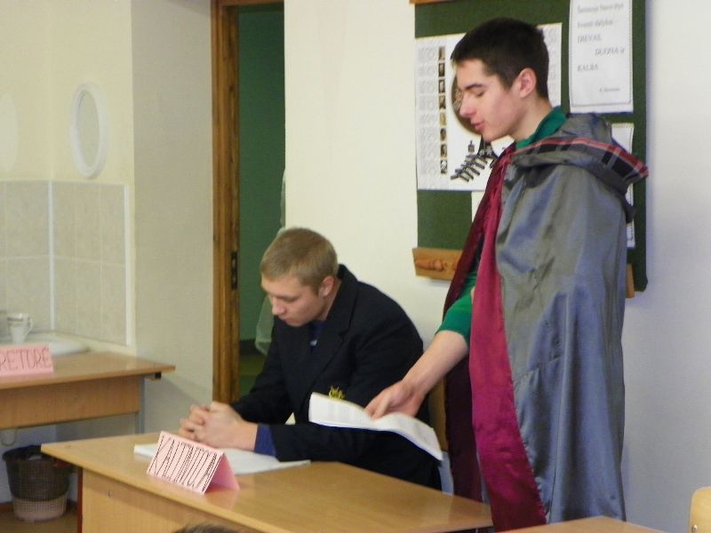 Džiaugiamės, kad savo ,,teismo salėje“ sulaukėme svečių. ,,Teismo procesą“ stebėjo gimnazijos direktoriaus pavaduotojos Gražina Šibekienė ir Eglė Kiriuškinienė, bibliotekos vedėja Aldona Dailydkaitė, lietuvių kalbos mokytojos Irena Blažukonienė, stažuotoja Katažina Snigiriovienė. Ši pamoka mums labai patiko. Mes turėjome galimybę tapti dramos veikėjais ir pabūti teismo dalyviais. Tikimės, kad ateityje organizuosime ir daugiau tokių įdomių pamokų.