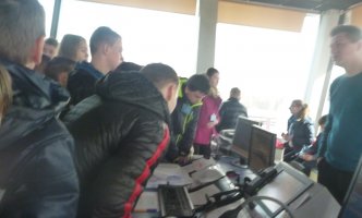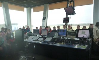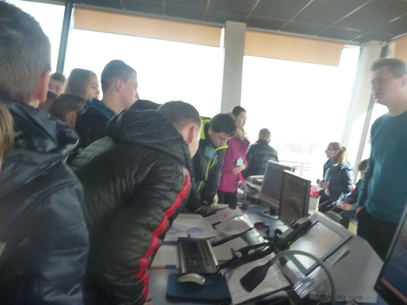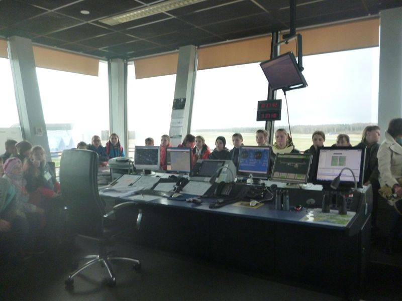 Prie oro uosto durų mus pasitiko gidai Paulius ir Tomas. Palydėjo į terminalą, kur nusipirkome bilietus ir pasiruošėme į „kelionę“ po oro uostą. Pirmiausiai pakilome į skrydžių valdymo bokštą ir susipažinome su skrydžių valdymo technine baze, dispečerio darbu. Gidai papasakojo apie teritorijos planą bei oro uosto struktūrą.