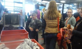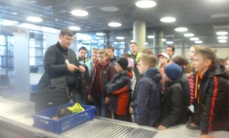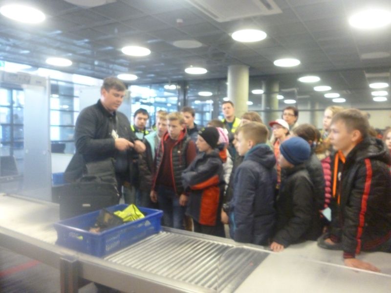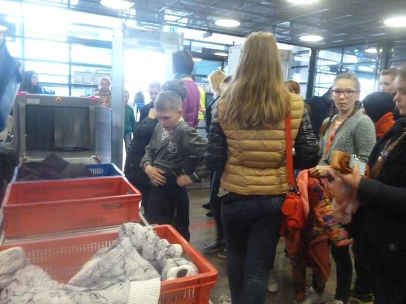 Vėliau praėjome asmens bei turimų daiktų patikrą. Susipažinome su saugos tarnybos darbuotojų pareigomis bei įrenginiais. Palaukėme laukimo salėje, kol atvažiuos autobusas. Visi tapome oro uosto keleiviais, nes autobusas mus nuvežė į „pakilimo-nusileidimo“ taką. Parodė, ką mato lėktuvo, kuris leidžiasi, pilotas. Visas „pakilimo-nusileidimo“ takas buvo apšviestas skirtingų spalvų švieselėmis. Labai įspūdingas vaizdas. Mums labai pasisekė: realiu laiku ir iš arti stebėjome lėktuvo nusileidimą. Turėjome puikią galimybę nusifotografuoti prie stovėjimo aikštelėje stovinčio lėktuvo.