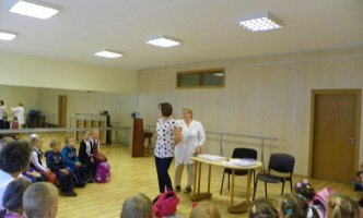 Sveikatos priežiūros specialistė J.Salabudo pirmokams paaiškino, kokią neigiamą įtaką sveikatai turi per sunki ir netaisyklingai nešiojama kuprinė.