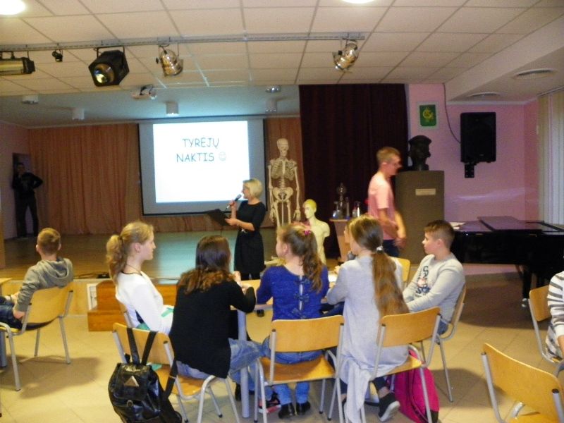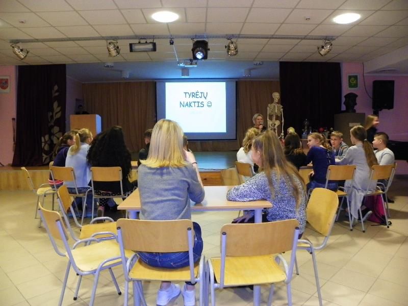 Įdomiausias - baigiamasis savaitės renginys ,,Tyrėjų naktis“ vyko penktadienį vakare. Šio renginio metu vyko du konkursai: ,,Užduočių takas“ ir ,,Protų mūšis“. Per pertraukas mokiniai galėjo atsigerti ir pasivaišinti skaniais pyragais ir pyragaičiais. O pasibaigus visiems vakaro konkursams, savaitės nugalėtojai ir dalyviai buvo apdovanoti padėkos raštais bei dovanėlėmis. Šio vakaro programą užbaigėme filmo peržiūra.