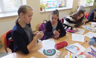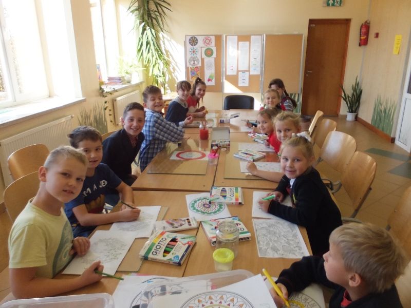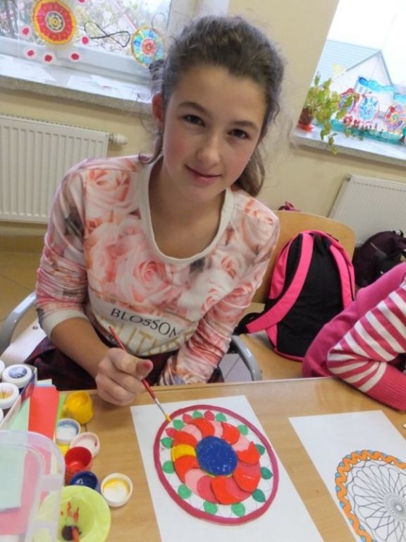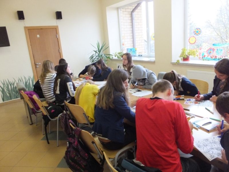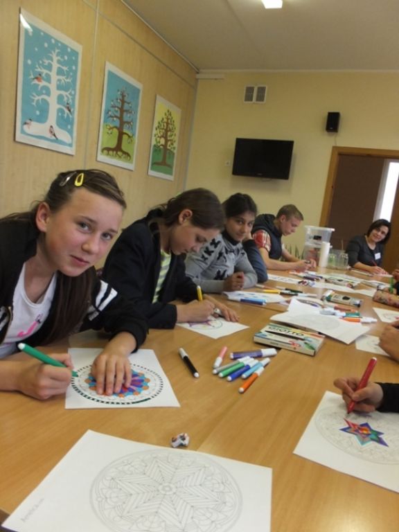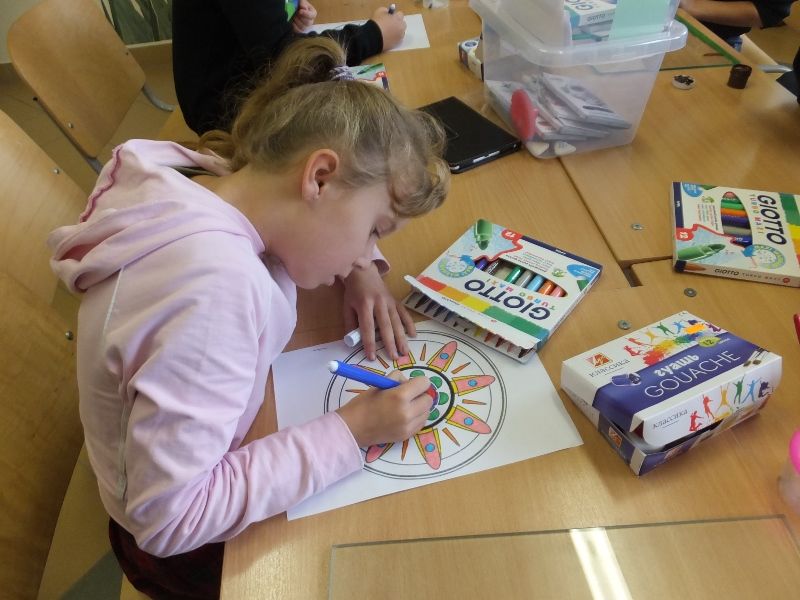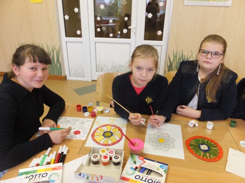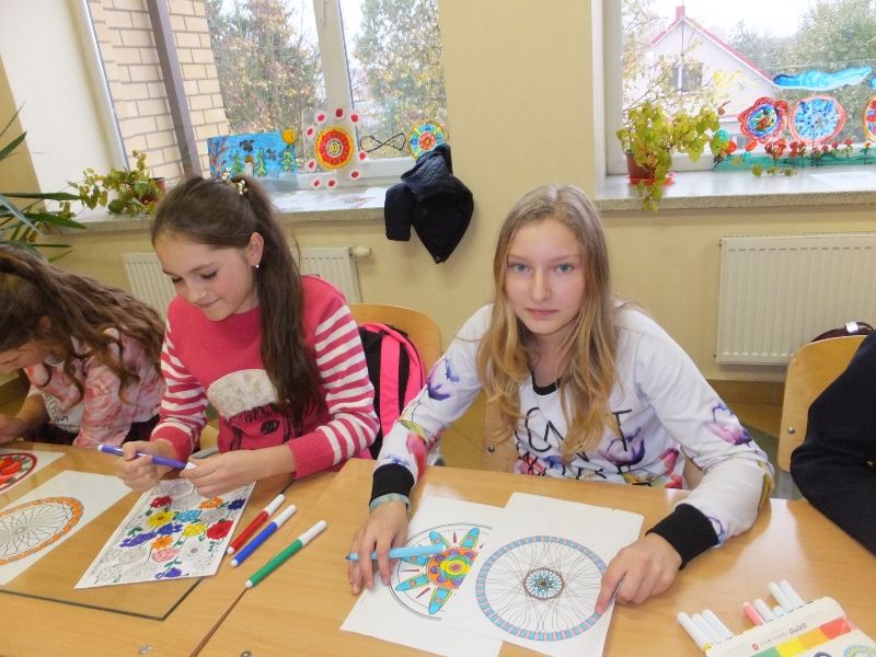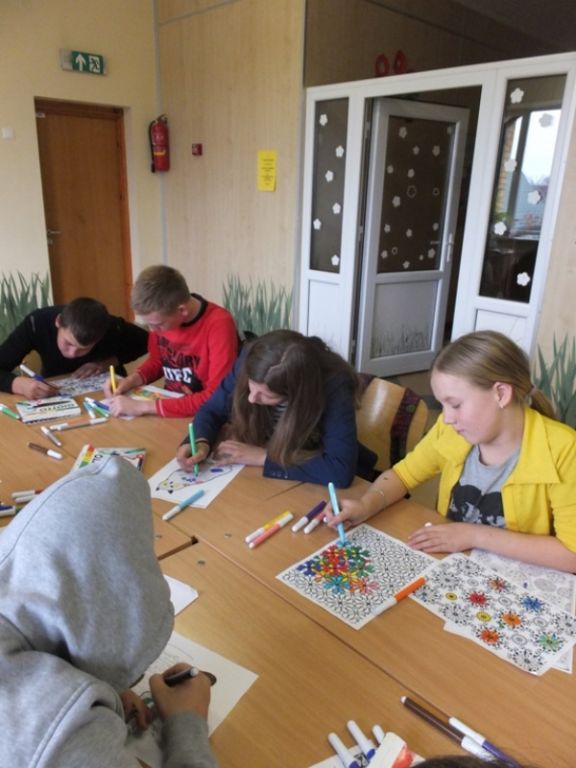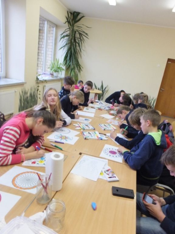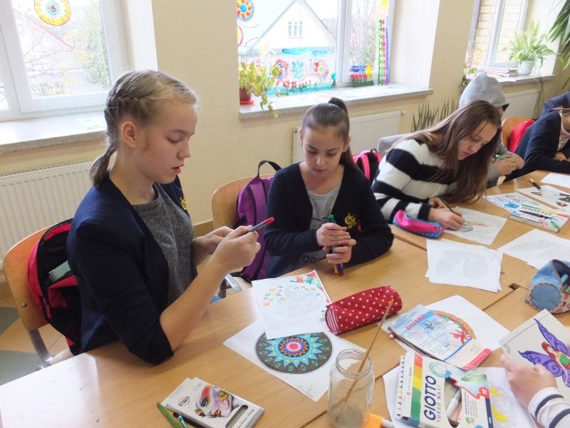 Vienas iš stresą mažinančių veiksmų – piešimas. Visą savaitę mokiniai turėjo galimybę pertraukų metu ir po pamokų piešti guašu, flomasteriais, pieštukais. Piešė ant stiklo ir popieriaus. Vaikų poilsio erdvė virto meninės terapijos erdve. Jie piešė ir spalvino... MANDALAS! Mandala – tai vienas iš būdų geriau pažinti save, žvilgtelėti į pasąmonės gelmes ir ... atsipalaiduoti.