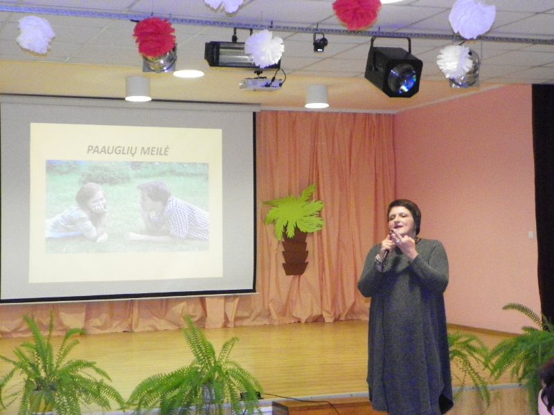 “Meilė – tai dviejų žmonių jausmas, jo negalime paaiškinti. Kai įsimyli, tu galvoji apie mylimą žmogų ir daugiau apie nieką. Tu jauti džiaugsmą, laimę, o kai mylintis žmogus neatsako tuo pačiu, jauti liūdesį. Kartais žmonės nekenčia savęs už tai, kad myli ir daro kvailus dalykus. Meilė keičia visą gyvenimą.“ Šiais mūsų gimnazijos dešimtokės žodžiais pradėjome renginį, skirtą paauglių tėvams „Paauglių meilė“. Labai džiaugėmės, kad jau antrus metus iš eilės paskutinį vasario ketvirtadienį gimnazijoje susirinko nemažas būrys tėvų, kurie norėjo sužinoti, kaip elgtis, kai jų paauglį kankina meilė.