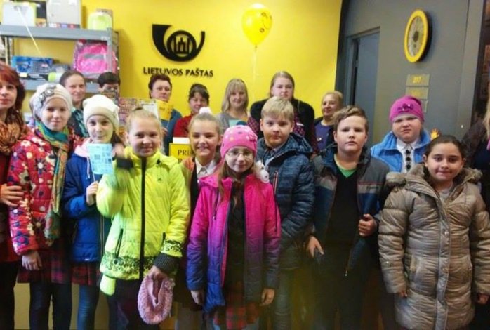 Artėjant Pasaulinei pašto dienai mokiniai pasveikino pašto darbuotojas, deklamavo eilėraščius, įteikė vėliavėles ir pripučiamus geltonus balionus su gerai žinomu ženklu - pašto ragelis geltoname laukelyje. Pašto viršininkei įteiktas padėkos raštas ir gėlės, o mokiniai palepinti saldainiais. Pamoka pašte buvo tikrai įdomi.