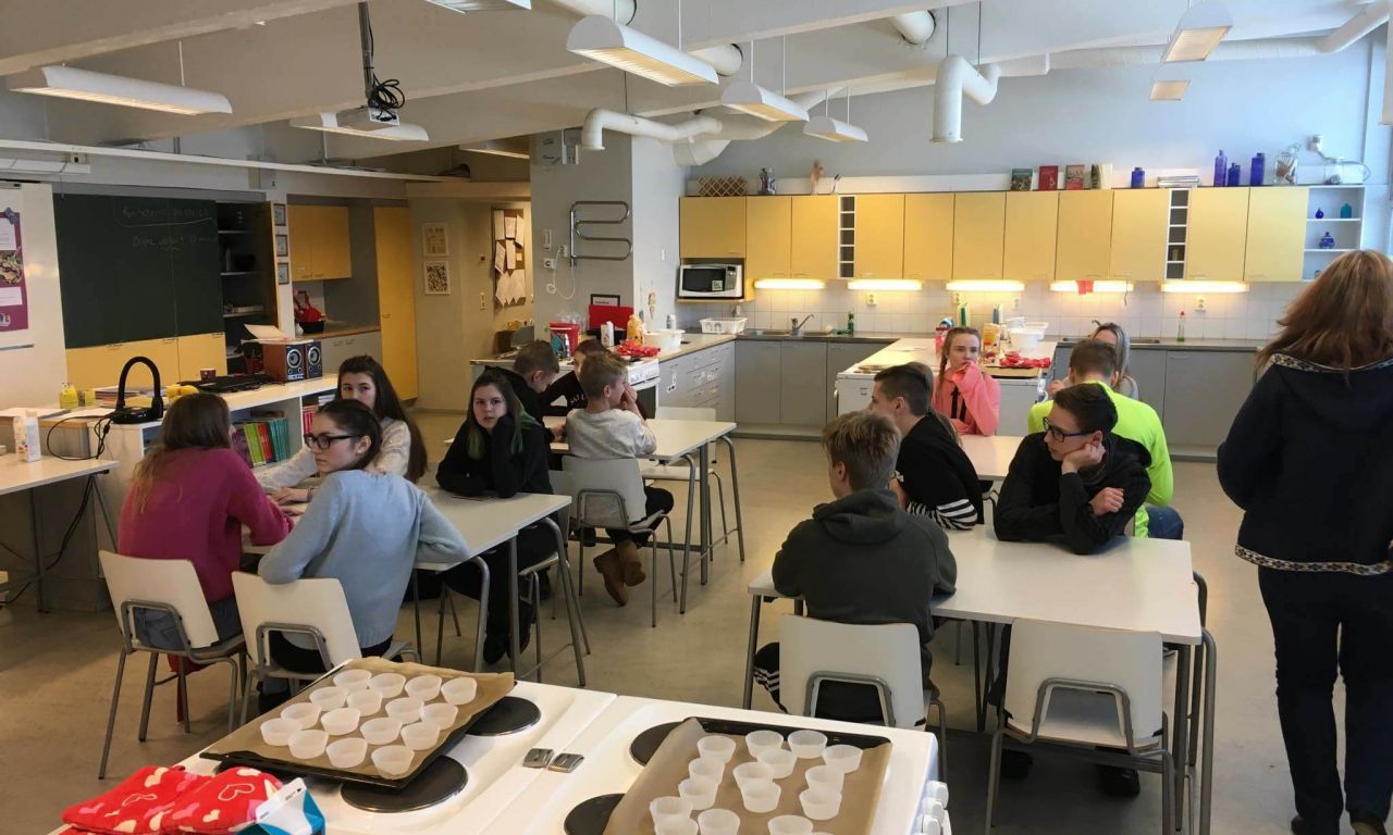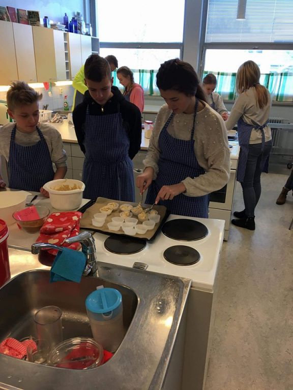 Pirmadienio rytas prasidėjo suomiškoje pamokoje. Stebėjome, kuo skiriasi Suomijos mokinių pamoka nuo mūsų. Vėliau žiūrėjome cirko klasės pasirodymą. Galėjome nemažai pasimokyti iš to, ką matėme, t.y. sustoti į nedideles piramides, atlikti įvairius lengvus akrobatikos pratimus ir t.t. Apžiūrėjome mokyklą, kurioje mokosi virš 900 mokinių. Gaminome ir tradicinius suomių keksiukus - Runebergo keksiukus, skirtus Suomių himno autoriui. O smagiausia dalis – keksiukų ragavimas su arbata. Kiek pailsėję, kiekvienas su šeima, kurioje gyvenome, važiavome žvalgytis po miestą, aplankyti įvairias įdomias miesto vietas.
