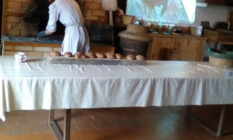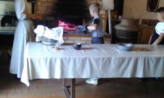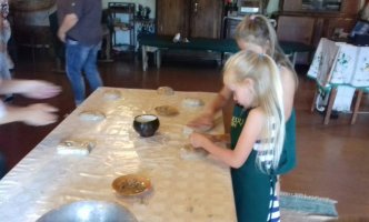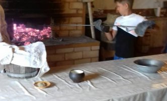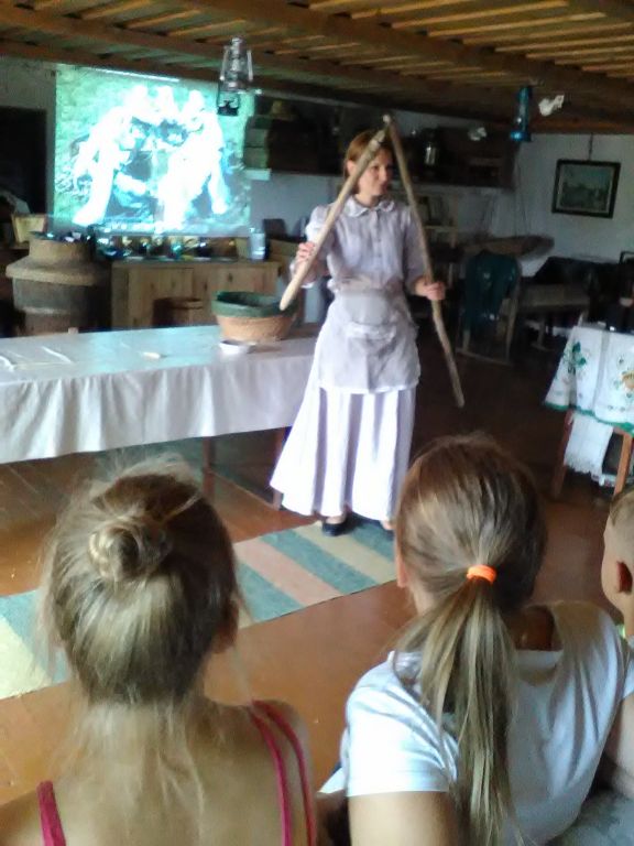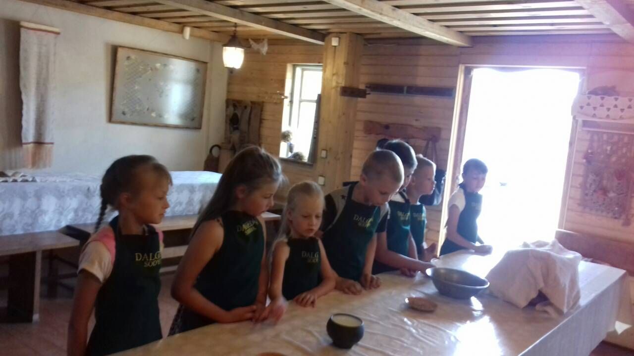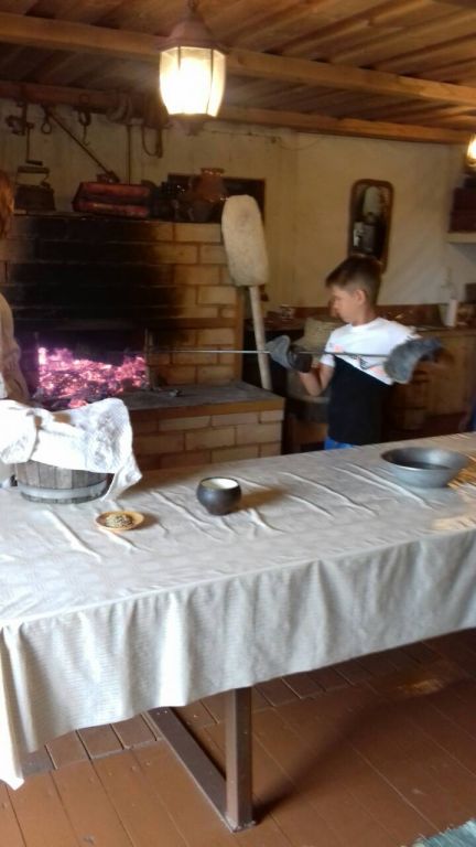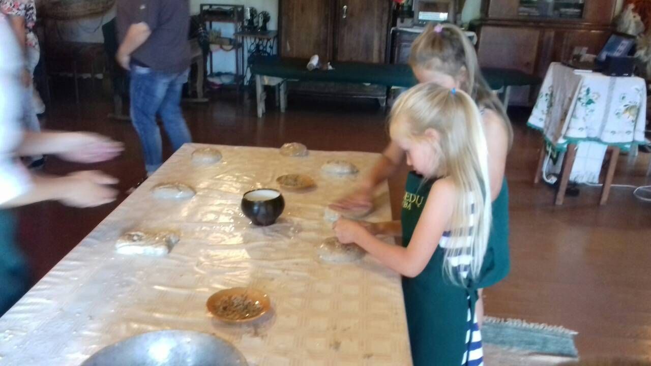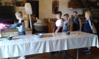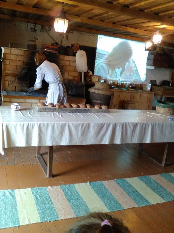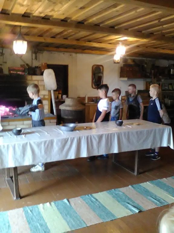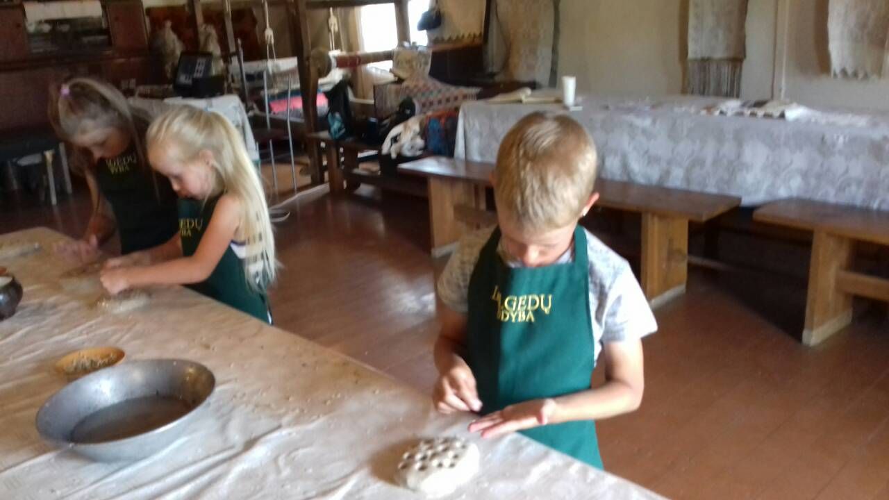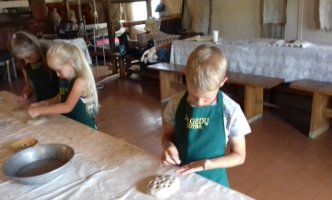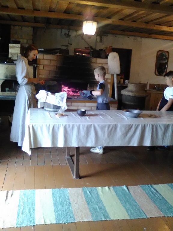 Sodybos šeimininkė pakvietė visus į etnografinį kambarį, kuriame buvo duonkepė krosnis ir kiti senoviniai buities rakandai. Vaikai šiame kambaryje prie ilgo stalo iš jau paruoštos tešlos formavo duonos kepaliukus. Stebėjo, kaip jie pašaunami į krosnį.