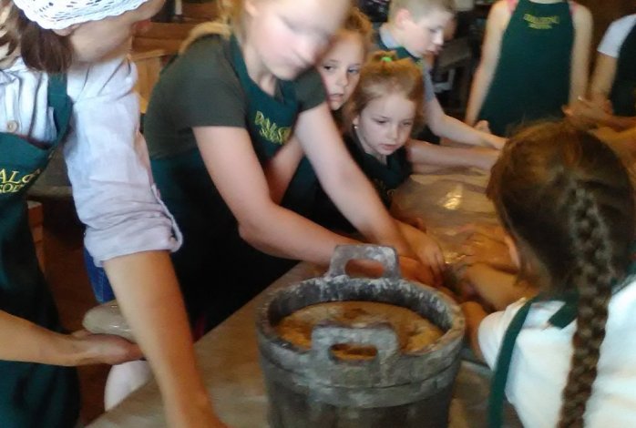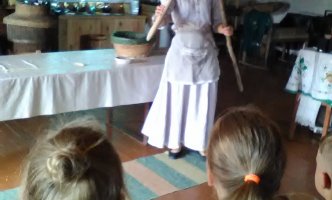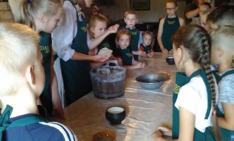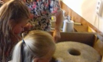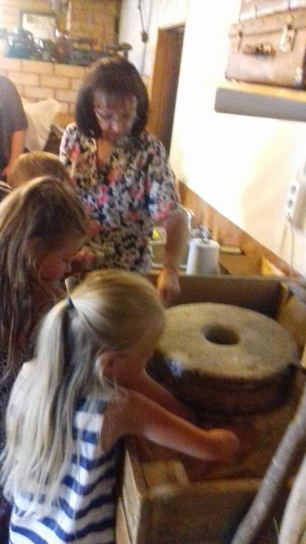 Kol duonelė kepė, mokiniai mokėsi atskirti grūdus, iš kurių kepama duona. Sodybos šeimininkė įdomiai pasakojo apie duonos kelią nuo sėjos iki tešlos užmaišymo ir pašovimo į krosnį. Supažindino su senovės rakandais, kuriais buvo malami, pjaunami ir kuliami rugiai. Kiekvienas pabandė sukti girnas. Buvo nustebę, kai sužinojo, jog šį darbą dirbo vaikai. Nes sukti girnas pavyko ne kiekvienam.