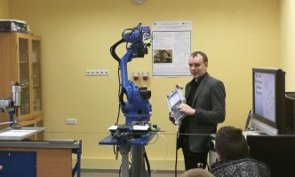 Edukacia prasidėjo pažintimi su įdomiąja robotika. Mokiniai lankėsi MF Mechatronikos ir robotikos mokomojoje laboratorijoje, kur sužinojo apie pramoninių robotų taikymo galimybės ir jų valdymo ypatybės, kurias pristatė ir pademonstravo MF Mechatronikos, robotikos ir skaitmeninės gamybos katedros lektorius Andrius Dzedzickis.