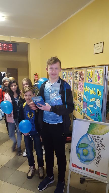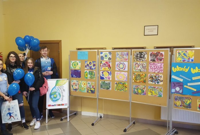 Kovo 22 dieną švenčiama Pasaulinė vandens diena. Erasmus + tarptautinio projekto „Love every drop“ dalyviai visus gimnazijos bendruomenės narius pasitiko su šventine nuotaika bei mėlynos spalvos oro balionais su užrašais „Vanduo – gyvybės šaltinis“. Šia proga jie paruošė lankstinukus „Kodėl svarbu saugoti vandenį?“, kuriuose nurodė 5 priežastis, kodėl reikia saugoti vandenį bei 5 praktiškus patarimus norintiems taupyti vandenį.