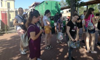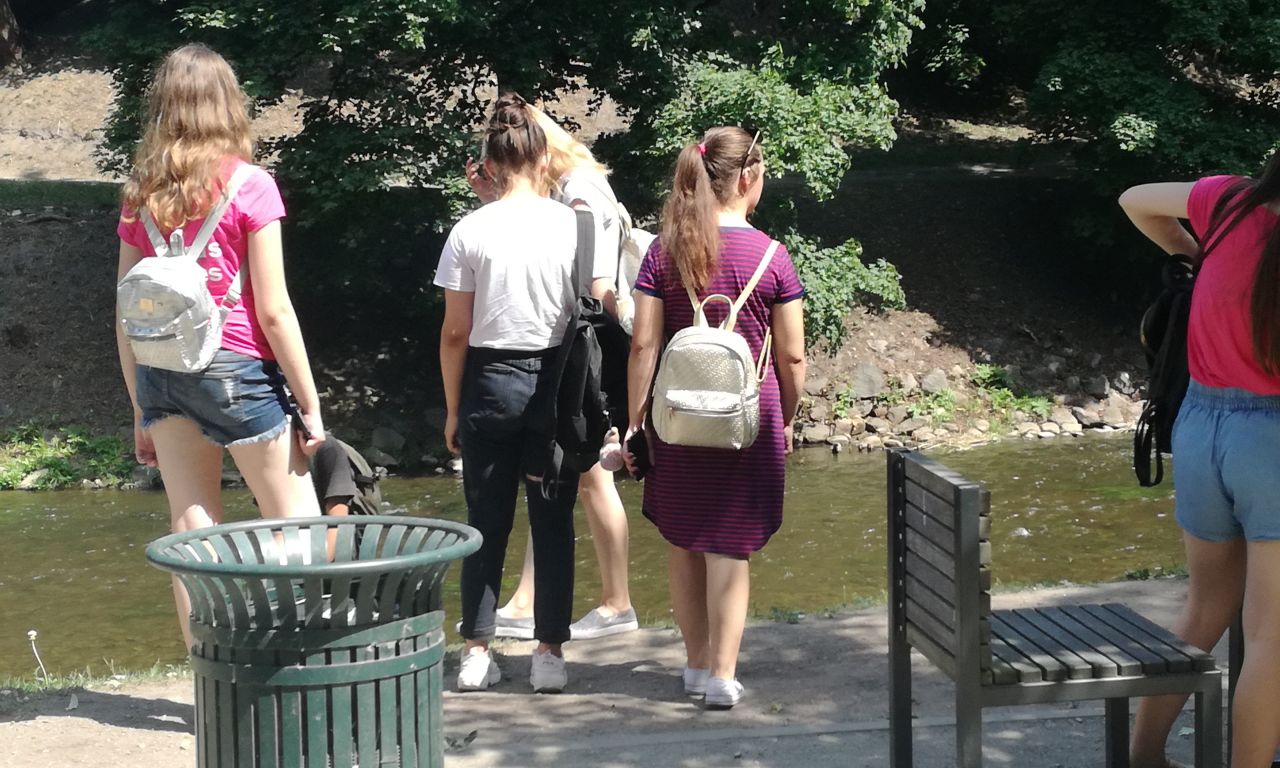 Kitas ekskursijos etapas – filmo „Ekskursantė“ peržiūra ir aptarimas. Kadangi turėjome minutę laisvo laiko, prieš kino seansą užsukome į Bernardinų sodą. Ten mokiniai atsigaivino šalto vandens fontanais.