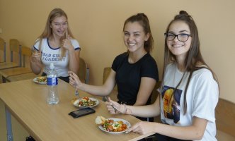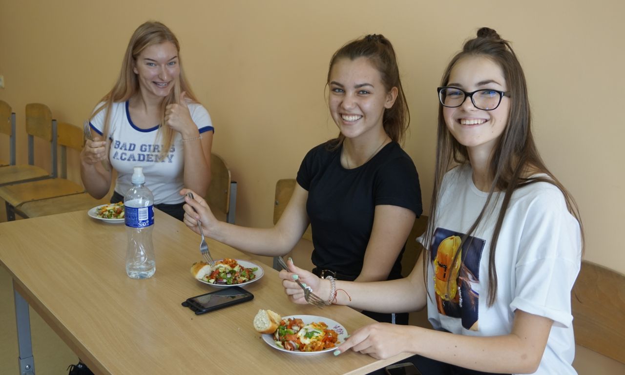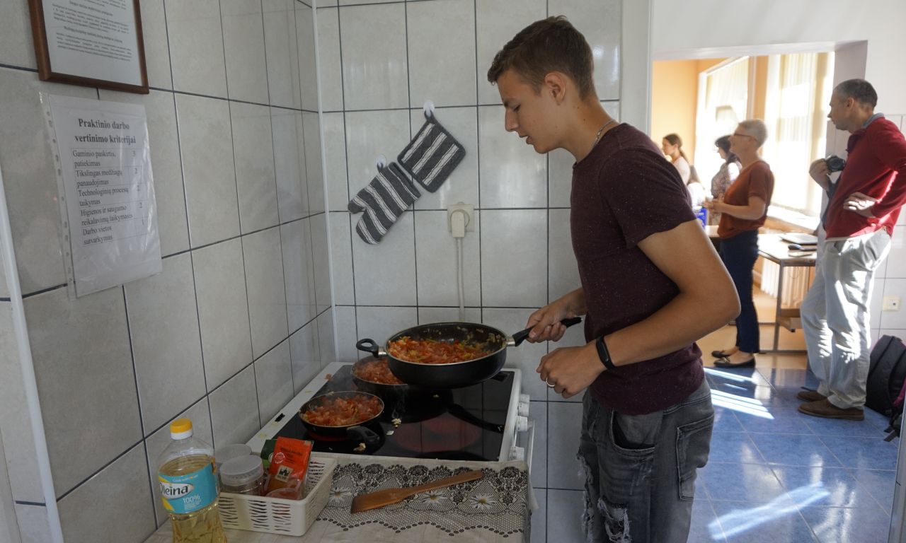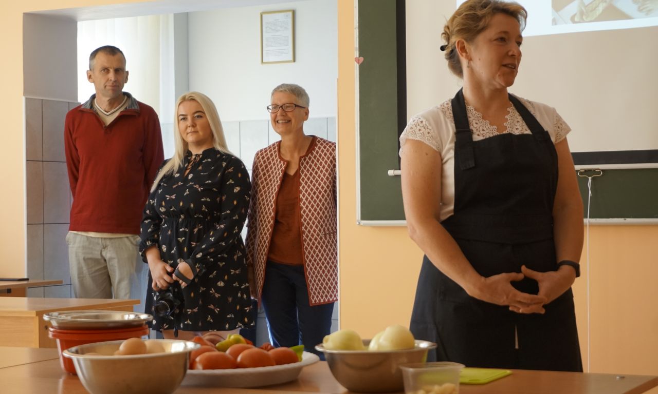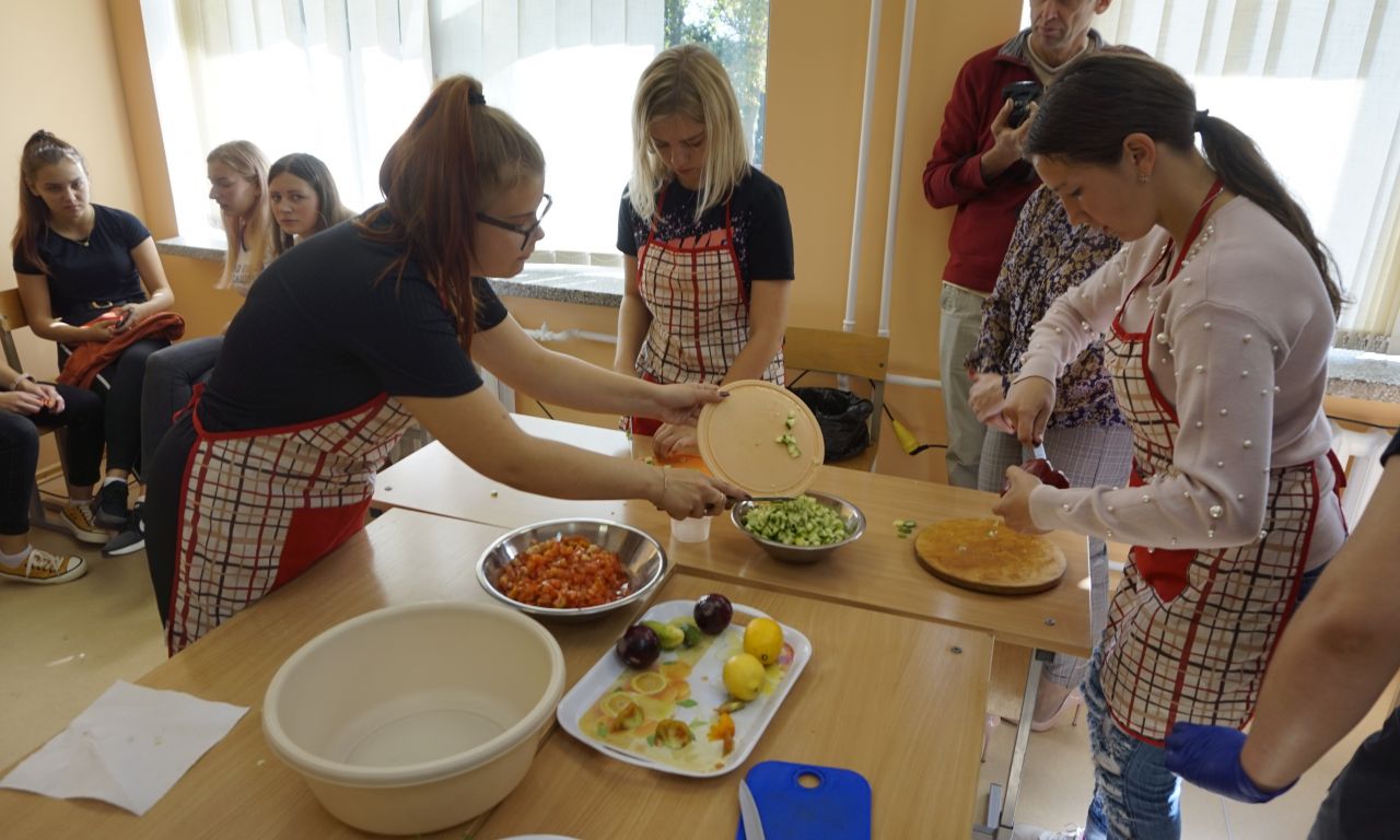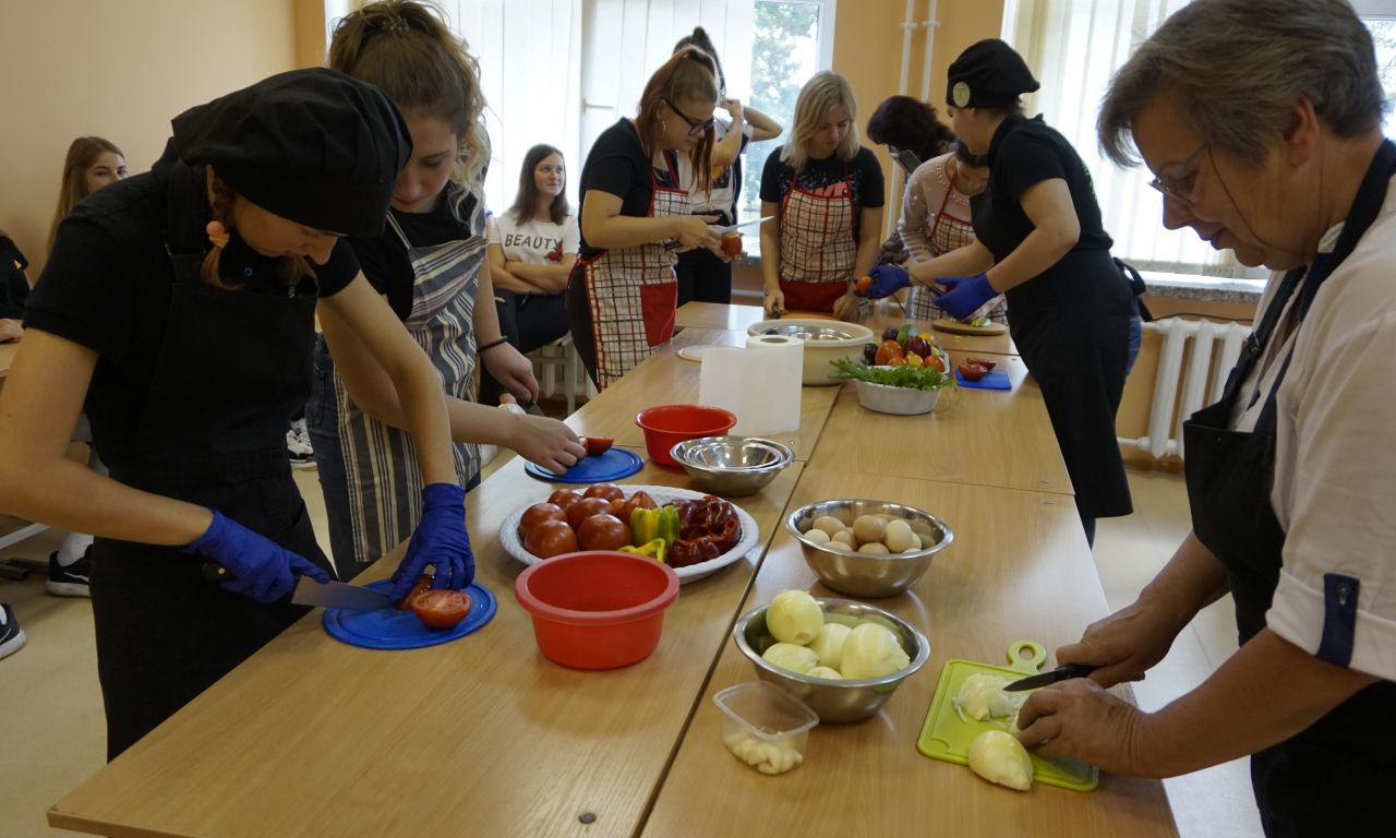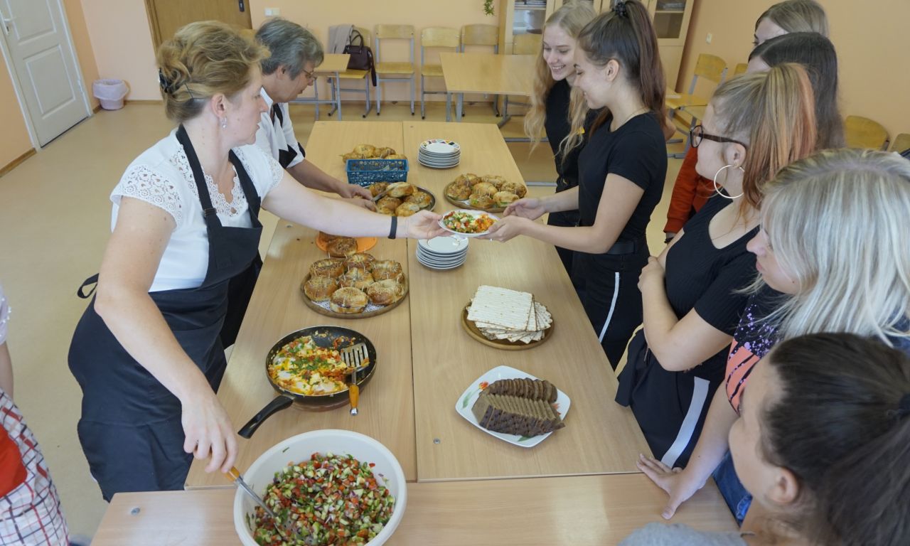 Labai džiaugiamės, kad į svečius atvyko Šalčininkų r. Dieveniškių TVM komanda. Šios mokyklos direktorė Ilona Šedienė papasakojo apie žydišką virtuvę, o virėjo ir konditerio PM mokiniai ir mokytojai pamokė gaminti šakšuką (kiaušinienę su daržovių padažų), siūlė ragauti tradicinių žydiškų riestainių beigelių. Smagu buvo gaminti, o dar smagiau ragauti.