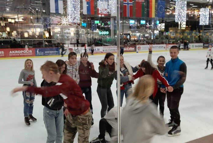 Smagu, kad baigę žiūrėti filmą ir dalindamiesi autobuse įspūdžiais, gimnazistai nusprendė kelionę pratęsti. Užvažiavę į ,,Akropolį“, visi draugiškai aplankė Ledo areną ir visą valandą aktyviai čiuožinėjo. Į gimnaziją grįžo ne tik prasmingai praleidę laiką, bet ir gerai pailsėję.