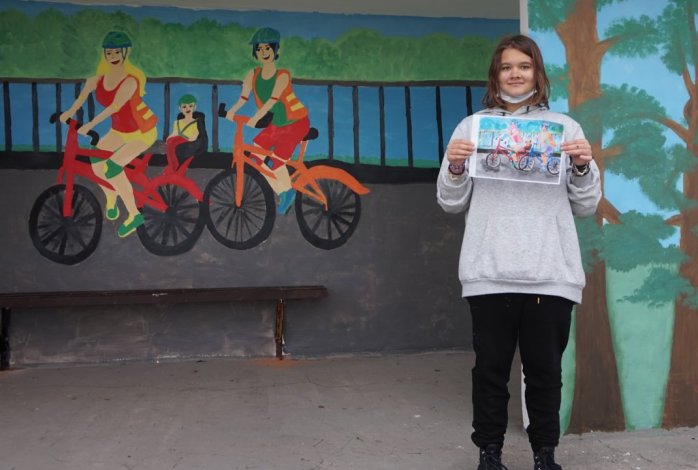 Šiuo renginiu siekiama atkreipti eismo dalyvių dėmesį į saugaus eismo svarbą, skatinti visus eismo dalyvius keliuose elgtis atsakingai. Austėja piešė dviratininkus, o visi kiti mokiniai tapė ir spalvino pagal jos eskizą. Piešėme apie 3 valandas, tačiau niekas nepavargo. Buvo įdomu tapyti ne ant popieriaus lapo, o ant stotelės sienos.