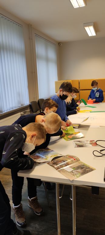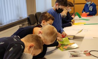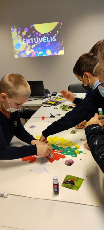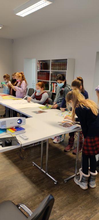 Vėliau apžiūrėjome bibliotekoje eksponuojamą parodą ,,O kas gi tu esi, Tėvyne, jei ne mes...“, skirtą Vasario 16–ajai. Vaikų laukė edukacinė – kūrybinė valandėlė, skirta Vasario 16-ajai – Lietuvos valstybės atkūrimo dienai - paminėti. Trečiokai, dirbdami grupėse, papuošė „medžius“ Lietuvos vėliavos spalvų lapais, gražiausiais žodžiais apie Lietuvą ir gamtos vaizdų paveikslėliais. Pabaigę pristatė savo plakatus, pasidžiaugė gražiais darbeliais ir ,žinoma, gavo dovanų - po penalą su rašikliu, knygų skirtuką ir saldainį.