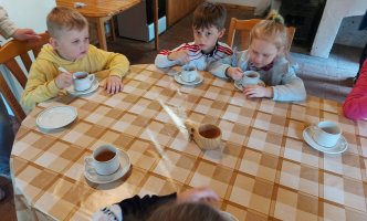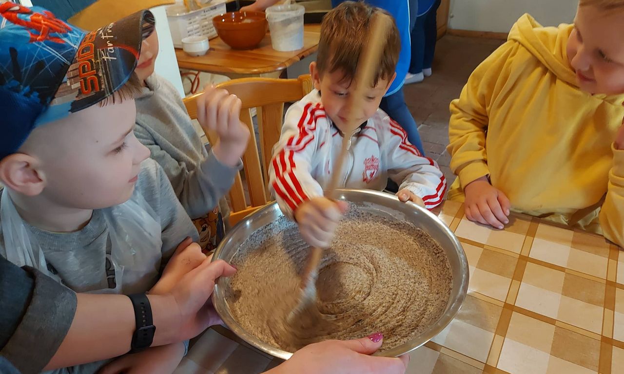 Pasivaikščioję gryname ore, vaikučiai praalko. Taigi, kelionė tuo nesibaigė. Važiavome į Darželių kaimą kepti „grikinės babkos“. O kas ta „grikinė babka“ , nė vienas neįsivaizdavo! Mus pasitiko kepėja. Visi galvojo, kad „grikinė babka“ jau iškepta, o ne... , pasirodo kepsime ją patys. Vaikai užsirišo prijuostes ir kibo į darbus: maišė tešlą, plakė kiaušinius ir.... Po gero pusvalandžio pakvipo visa patalpa, vaikai nekantriai laukė stebuklo, kurį patys iškepė. Pasivaišinę arbata ir „grikine babka“, pilni įspūdžių grįžome namo. Kelionė pavyko, buvo labai smagu.