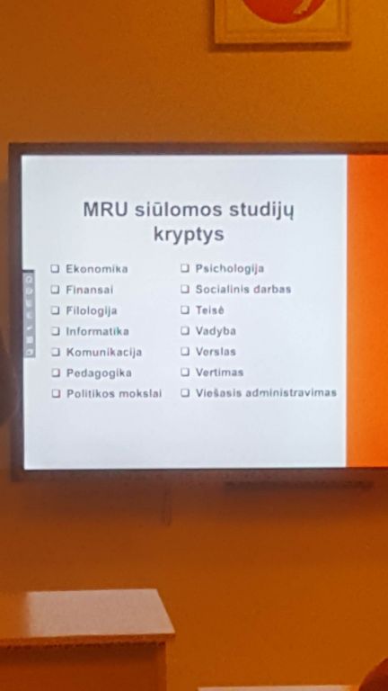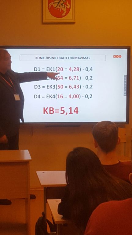 Sausio 26 d. III-IVG klasių gimnazistai 3 pamokos metu dalyvavo susitikime su Mykolo Romerio universiteto Nacionalinio priėmimo grupės vadovu Sauliumi Bugailiškiu. Susitikimo metu Saulius supažindino mokinius su studijų programomis, priėmimo tvarka. Akcentavo tai, kas svarbu abiturientams ir ko tikėtis IIIG gimnazistams. Pabrėžė kiekvienų mokslo metų skirtumus, nes reikalavimai vis keičiasi. Paaiškino, kaip yra skaičiuojamas konkursinis balas, skirstomos valstybės finansuojamos vietos, kaip kryptingai sudėlioti prioritetus ir kt. Universiteto atstovas atsakė į pateiktus klausimus, išdalino lankstinukus apie siūlomas programas, trumpai kiekvieną pakomentavo. Patarė, kad renkantis studijų programą, pirmiausia reikia pamąstyti ir nuspręsti, ką jaunas žmogus norėtų dirbti, o tik paskui leistis į studijų programų paieškas. Manau, susitikimas tikrai buvo naudingas.