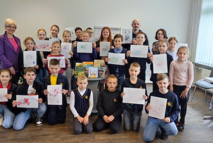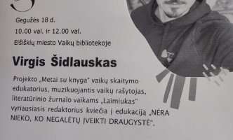 Gegužės 18 dieną 4a klasės mokiniai skubėjo į iš anksto suplanuotą susitikimą su Virgiu Šidlausku – rašytoju ir literatūrinio žurnalo „Laimiukas“ vyr. redaktoriumi, išleidusiu šešias prozos knygas vaikams. Nuo pat pirmosios – „Ulfas ir stebuklinga barzda” autorius pastebimas skaitytojų bei vaikų literatūros vertintojų, jo knygos dažnai patenka į geriausiųjų penketukus. Rašytojui būdingas gyvas, žaismingas bendravimas su auditorija, paįvairinamas muzikos bei dailės akcentais.