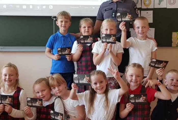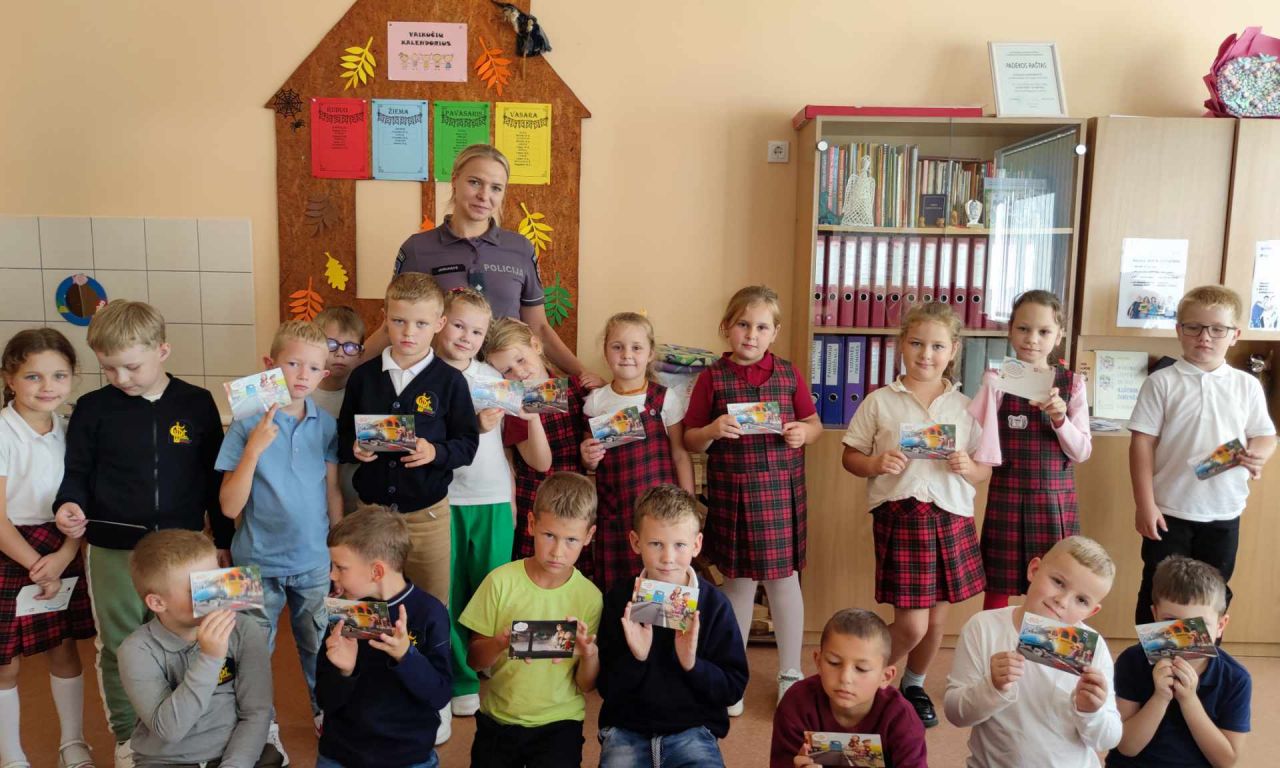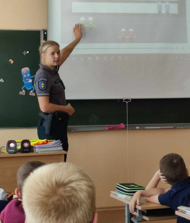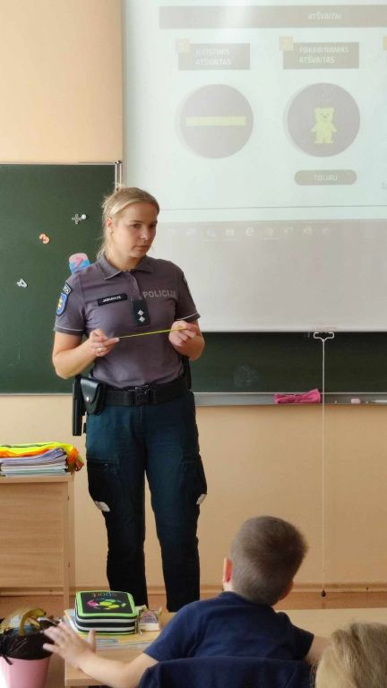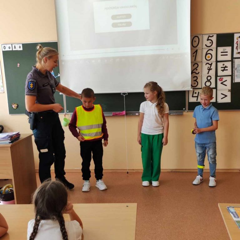 Rugsėjo 21 dieną mūsų gimnazijoje lankėsi bendruomenės pareigūnė Olga Jasiukaitė ir vedė pirmokėliams saugaus eismo pamokėles. Pamokėlių metu mokiniams pareigūnė priminė pagrindines saugaus eismo taisykles gatvėje, akcentavo, į ką reikia atkreipti dėmesį pereinant kelią, paaiškino atšvaito naudą ir parodė, kaip taisyklingai jį prisisegti. Mokinukai drąsiai atsakinėjo į klausimus, dalinosi savo įspūdžiais. Užsiėmimų pabaigoje pirmokai gavo dovanų atvirukus su kelių eismo taisyklėmis.
