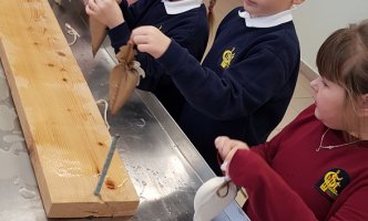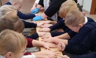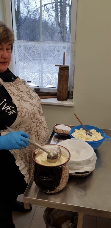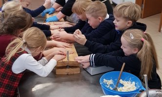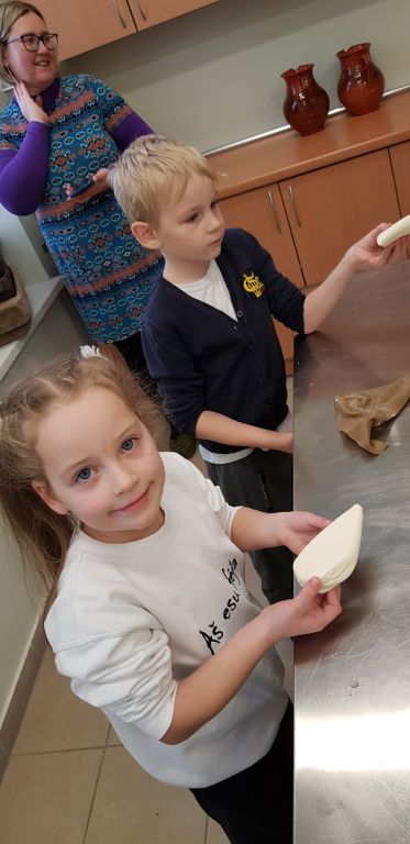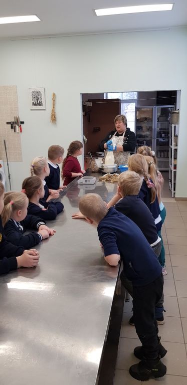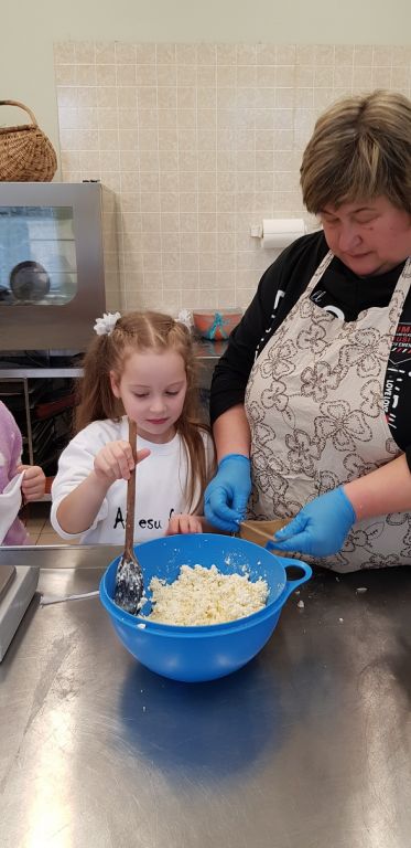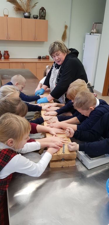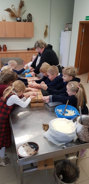 1B KLASĖS MOKINIAI SPAUDĖ SŪRĮ DARGUŽIŲ AMATŲ CENTRE
