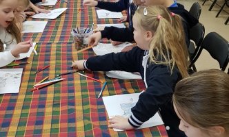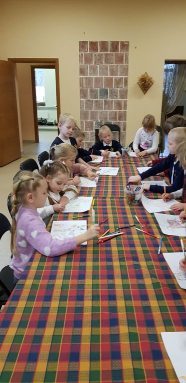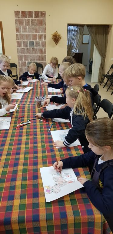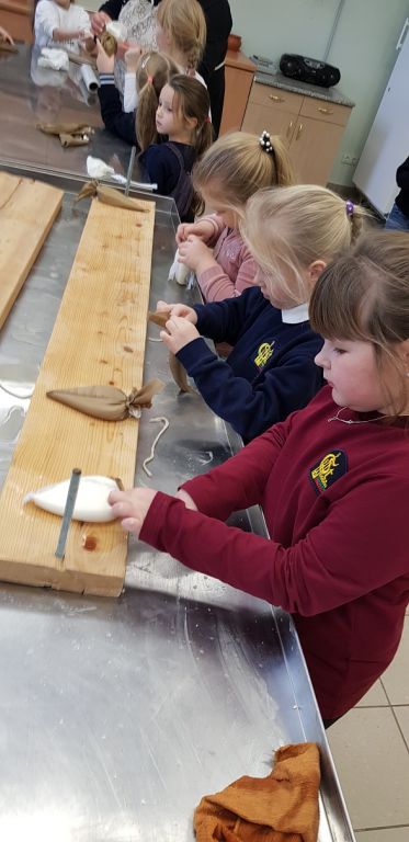 Sūrininkė Dalytė parodė, kaip iš rauginto pieno pasigaminti varškę, kaip paruošti varškę sūrio spaudimui. Kiekvienas pirmokas svėrė po 200 g paruoštos varškės, dėjo į sūrmaišius, o tuomet - sūrių slėgtuvę. Kol sūriai buvo slėgtuvėje, amatų centro vedėja Sigita papasakojo vaikams apie naminius gyvūnus, jų priežiūrą ir naudą žmogui. Mokiniai atliko kūrybinę užduotį: turėjo nuspalvinti karvutę, kuri duoda jų norimo skonio pieną (bananinį, ledų, apelsinų ir kt.), Pirmokai sugalvojo karvutei vardą.