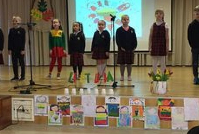 Vasario 15 dieną pradinukai, jų tėveliai ir mokytojai susirinko į gimnazijos aktų salę kartu švęsti 106-ojo Lietuvos gimtadienio. Ketvirtos klasės mokiniai su mokytoja Diana paruošė šventinę programą, papuošė salę. Šventėje vaikai deklamavo eilėraščius ir dainavo skambias, gražias dainas, skirtas Lietuvai. Didelį įspūdį paliko ketvirtokai, kurie kankliavo kanklėmis ir dainavo lietuvių liaudies dainas. Pradinukus dainuoti ir groti mokė muzikos mokytoja J.Sinkevič.