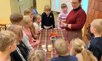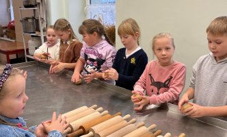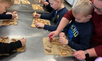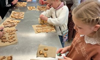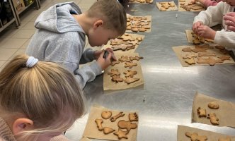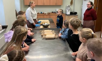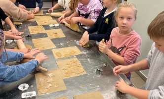 Kepėja Roberta paaiškino, kaip užminkyti imbierinę tešlą, kaip paruošti tešlą sausainių kepimui. Kiekvienas mokinys paruoštą tešlą iškočiojo ir, pasirinkęs norimą formelę, formavo sausainius. Kol sausainiai kepė, mokiniams amatų centro vedėja Sigita pasakojo apie Kūčių tradicijas ir papročius. Antrokai sužinojo apie Kūčių patiekalus, stalo serviravimą, o labiausiai mokiniams patiko burtai!