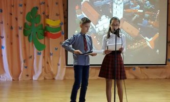 Renginio vedėjai, 6 klasės mokiniai Aistė Malinovska ir Romas Talmontas, pasitelkdami vaizdus, priminė Lietuvos vardo kilmę. Visi kartu prisiminėme, kokį sunkų kelią nuėjo Lietuva nuo akmens amžiaus iki Nepriklausomybės atkūrimo dienos.