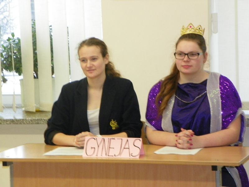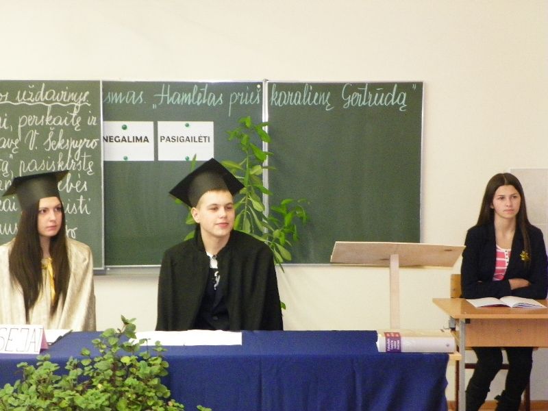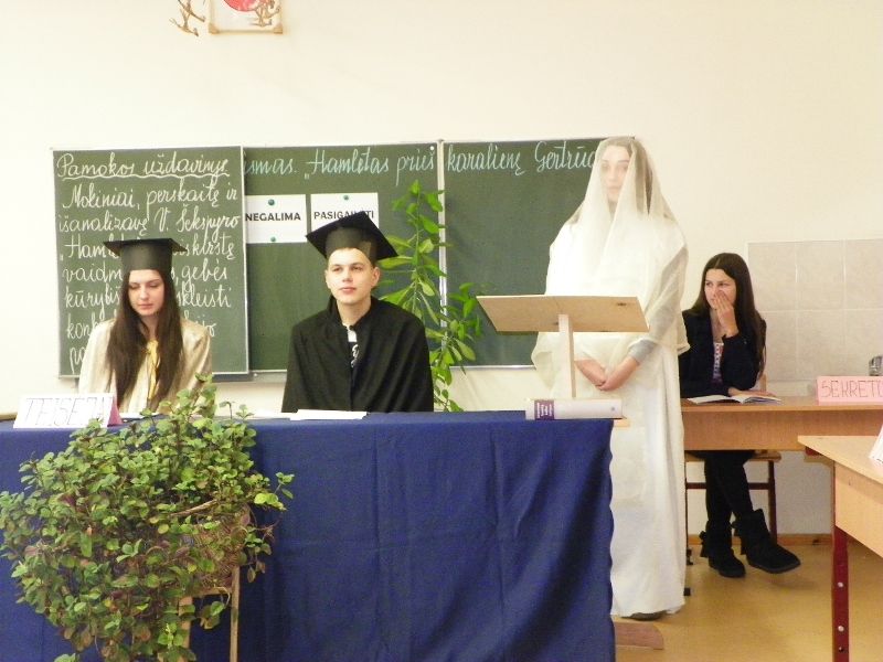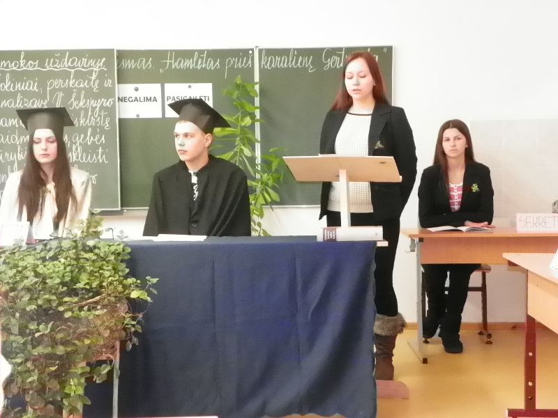 Lietuvių kalbos kabinetas virto ,,teismo sale“. ,,Visiems stot! Teismas eina,“ – garsiai ištarė teismo sekretorė (V.Parfimovičiūtė). Taip prasidėjo neįprasta literatūros pamoka. Teismo pirmininkė (teisėja M. Bruzgelevič), pranešė, kad karalienė Gertrūda kaltinama sūnaus Hamleto nesirūpinimu ir išdavyste. Prokuroras (R.Brozovskij), įgaliotas Hamleto (V.Leikauskas), sakydamas savo kalbą, negailėjo skaudžių žodžių karalienei, kaltino Gertrūdą ir kitais nusikaltimais, pateikė daiktinį įrodymą. Karalienė (K.Makarenko) neprisipažino kalta, o karalius Klaudijus (A.Jancevič) nuoširdžiai gailėjo silpnos moters, kuriai teko tokia sunki dalia. Vienas po kito buvo kviečiami liudytojai: Horacijus (V.Antul), Ofelija (S.Parvickytė), Hamleto tėvo dvasia (K.Choružaja). Uždėję ranką ant ,,Biblijos‘‘ ir prisiekę sakyti tiesą, jie pasakojo apie karalienės Gertrūdos, karaliaus Klaudijaus ir Hamleto santykius, atsakinėjo į teisėjo (A.Šibeko) klausimus. Advokatė (S.Kucevič) ginamojoje kalboje įtikinamai stengėsi paveikti teisėjus ir prisiekusiuosius bei išteisinti karalienę Gertrūdą. Teisėjai ir prisiekusieji, išklausę visų kalbų ir pasitarę, paskelbė nuosprendį: karalienė pripažinta kalta.